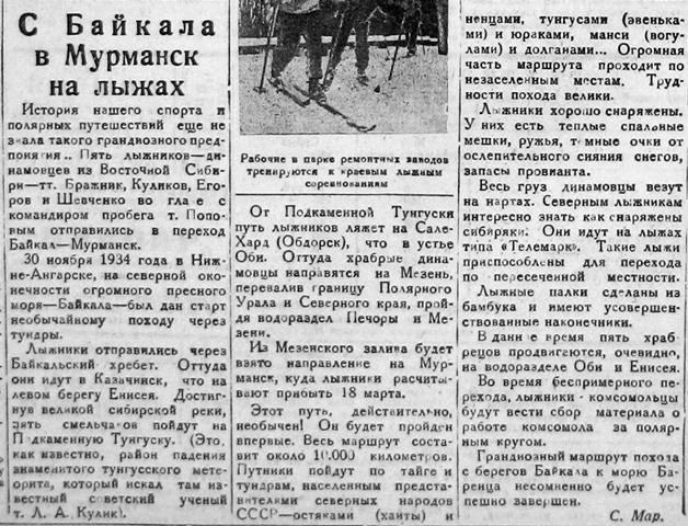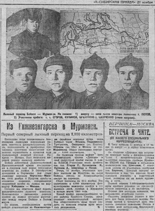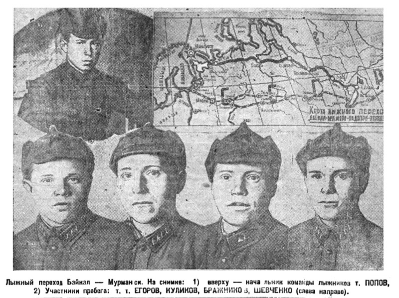 История нашего спорта и полярных путешествий еще не знала такого грандиозного предприятия. Пять лыжников — динамовцев из Восточной Сибири — тт. Бражник, Куликов, Егоров и Шевченко во главе с командиром пробега т. Поповым отправились в переход Байкал — Мурманск.