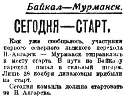 Как уже сообщалось, участники первого северного лыжного перехода Н.-Ангарск — Мурманск отравилась к месту старта. В пути по Байкалу пароход попал в сильный шторм. Лишь 29 ноября динамовцы прибыли на старт.
