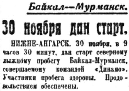 НИЖНЕ-АНГАРСК. 30 ноября, в 9 часов 30 минут, дан старт северному лыжному пробегу Байкал-Мурманск, совершаемому командой «Динамо». Участники пробега здоровы. Продовольствием обеспечены.