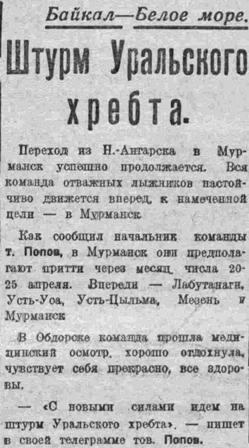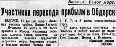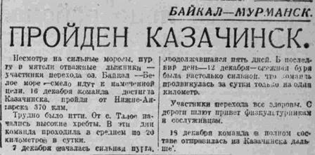 Невиданный в условиях Крайнего Севера лыжный переход из Нижне-Ангарска в Мурманск, совершаемый отважными динамовцами, под командой комсомольца тов. Попова, совершается успешно.