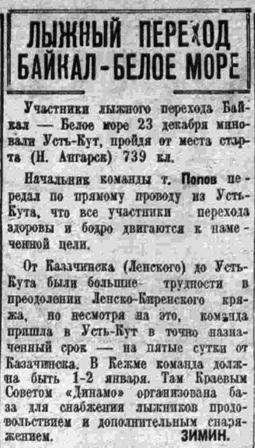 От Казачинска (Ленского) до Усть-Кута были большие трудности в преодолении Ленско-Киренского кряжа, но несмотря на это, команда пришла в Усть-Кут в точно назначенный срок — на пятые сутки от Казачинска. В Кежме команда должна быть 1-2 января. Там Краевым Советом «Динамо» организована база для снабжения лыжников продовольствием и дополнительным снаряжением.