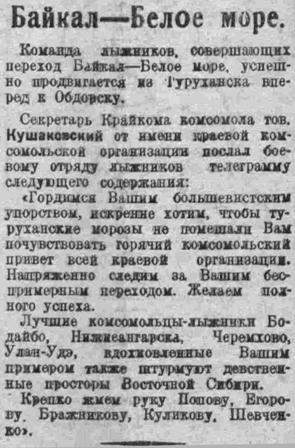 "Гордимся Вашим большевистским упорством, искренне хотим, чтобы туруханские морозы не помешали Вам почувствовать горячий комсомольский привет всей краевой организация. Напряженно следим за Вашим беспримерным переходом. Желаем полного успеха.