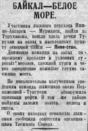 По дополнительно полученным сведениям команда лыжников около Подкаменной - Тунгуски обнаружила признаки нефти. В том же районе найдены залежи золота, железа и гипса.