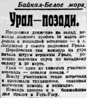 Начальник команды т. Попов передал по прямому проводу из Усть-Кута, что все участники перехода здоровы и бодро двигаются к намеченной цели.