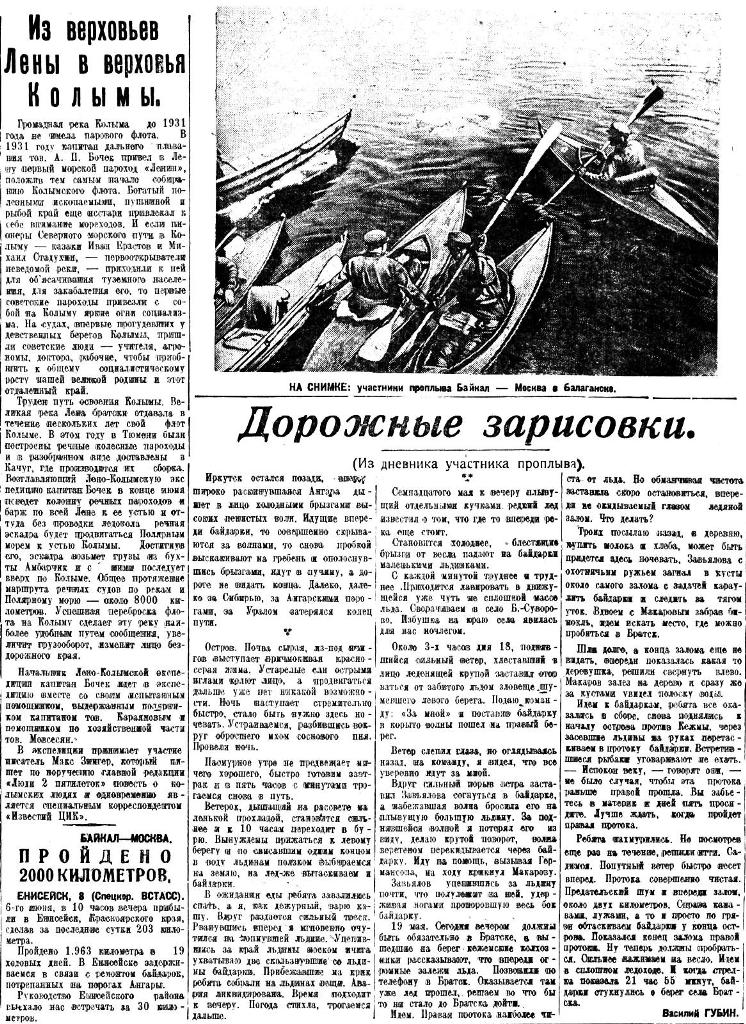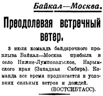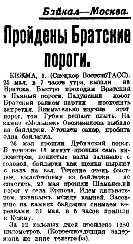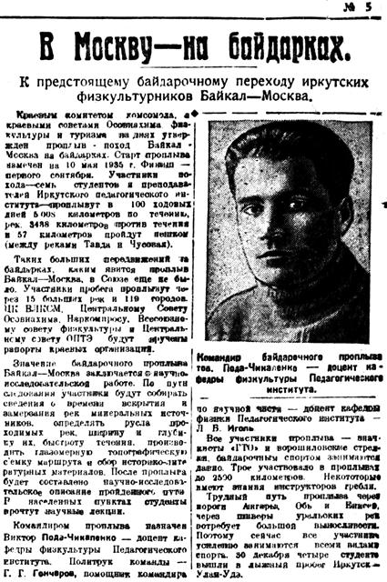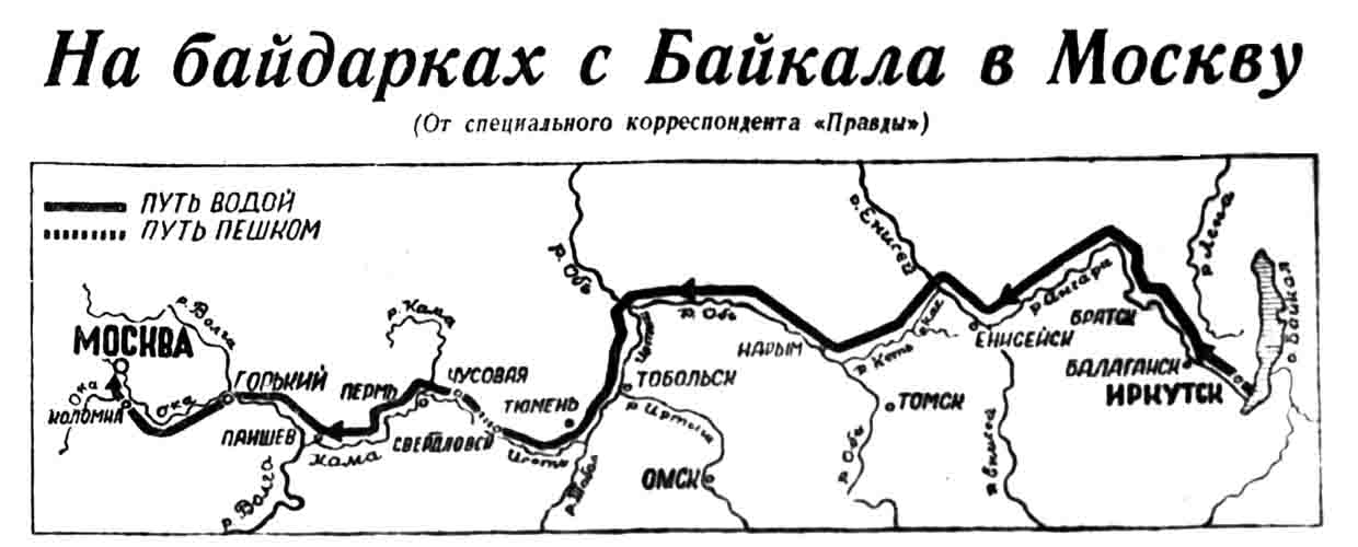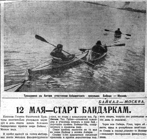 Краевым комитетом комсомола, и краевыми советами Осавиахима, физкультуры и туризма на днях утвержден проплыв - поход Байкал -Москва на байдарках. Старт проплыва намечен на 10 мая 1935 г. Финиш — первого сентября. Участники похода — семь студентов и преподавателей Иркутского педагогического института — проплывут в 100 ходовых дней 5008 километров по течению рек, 3438 километров против течение и 57 километров пройдут пешком (между реками Тавда и Чусовая).