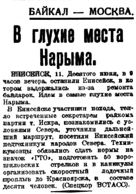 В Енисейске участники похода, тепло встреченные секретарем райкома партии т. Искра, познакомились с условиями Севера, уточнили дальнейший маршрут, посетили Енисейский педтехникум народов Севера. Техникумовцы обязались сдать нормы на значок "ГТО", подготовить 50 ворошиловских стрелков и в каникулы организовать скоростной лодочный проплыв до Красноярска, в составе десяти человек. (Спецкор ВСТАСС).
