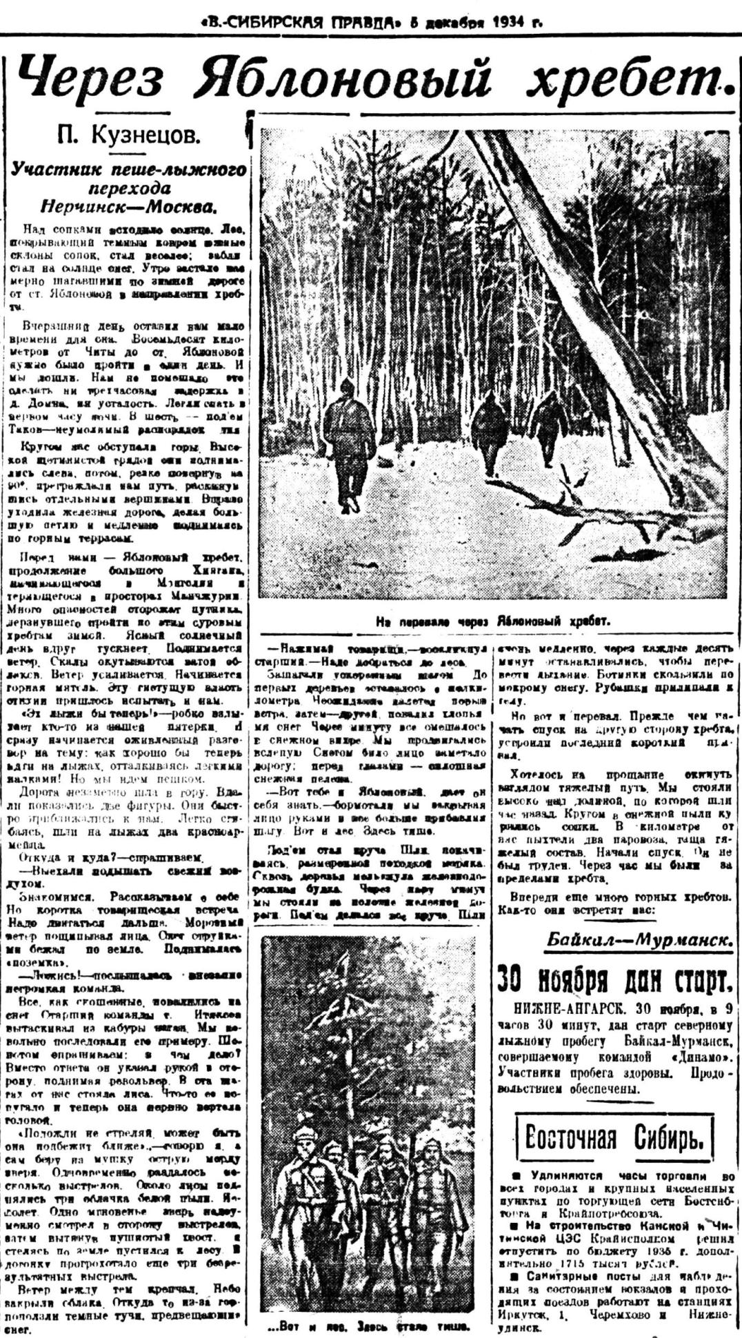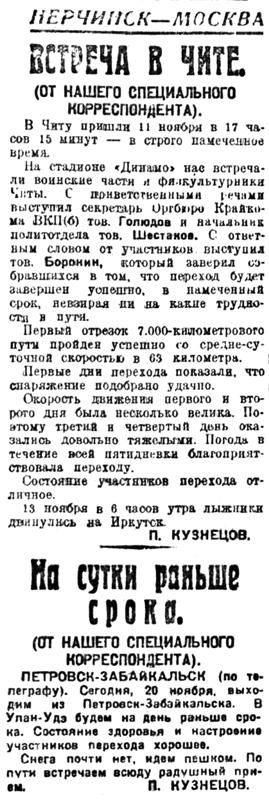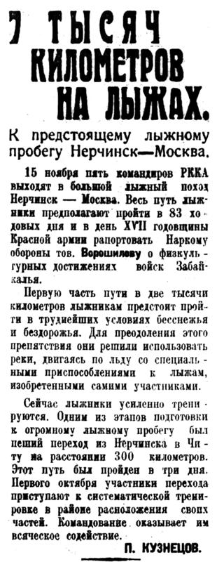 15 ноября пять командиров РККА выходят в большой лыжный поход Нерчинск — Москва. Весь путь лыжники предполагают пройти в 83 ходовых дня и в день XVII годовщины Красной армии рапортовать Наркому обороны тов. Ворошилову о физкультурных достижениях войск Забайкалья.