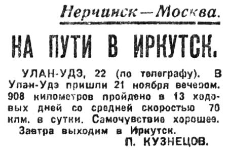 УЛАН-УДЭ, 22 (по телеграфу). В Улан-Удз пришли 21 ноября вечером. 908 километров пройдено в 13 ходовых дней со средней скоростью 70 клм. в сутки. Самочувствие хорошее. Завтра выходим в Иркутск.