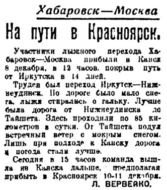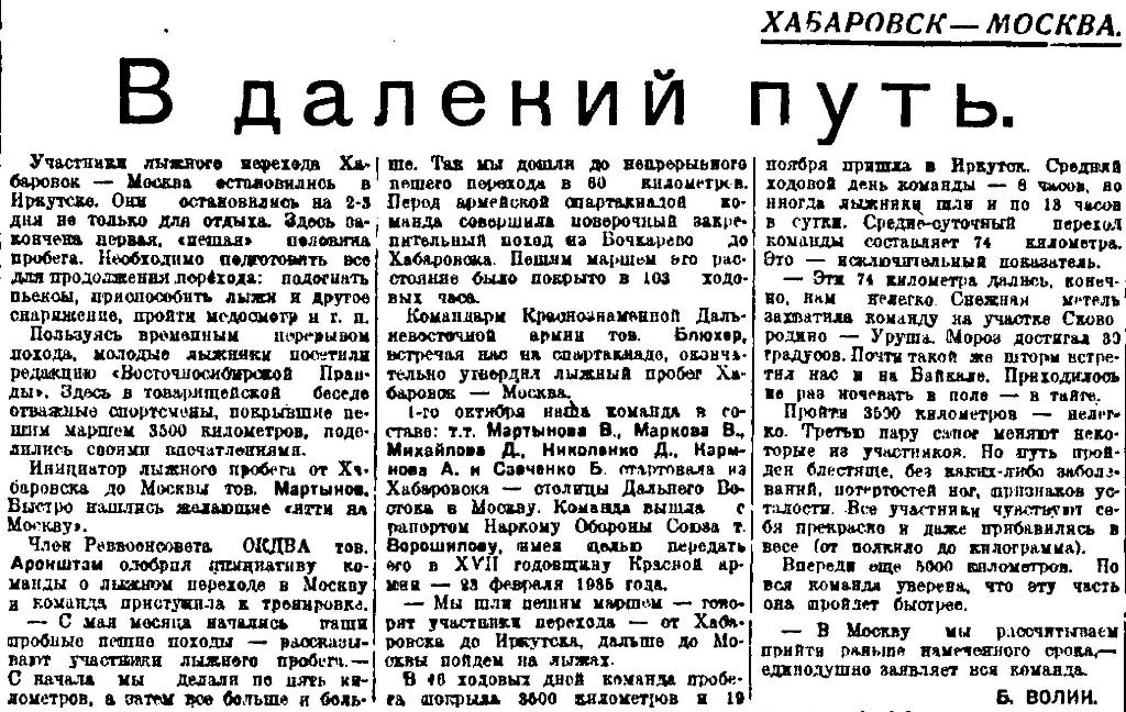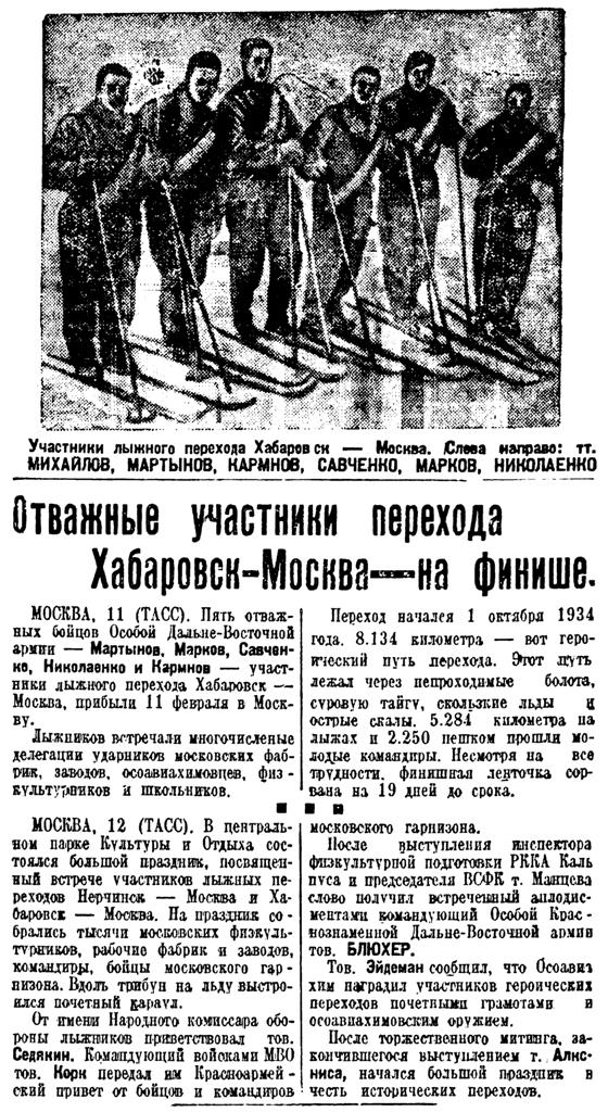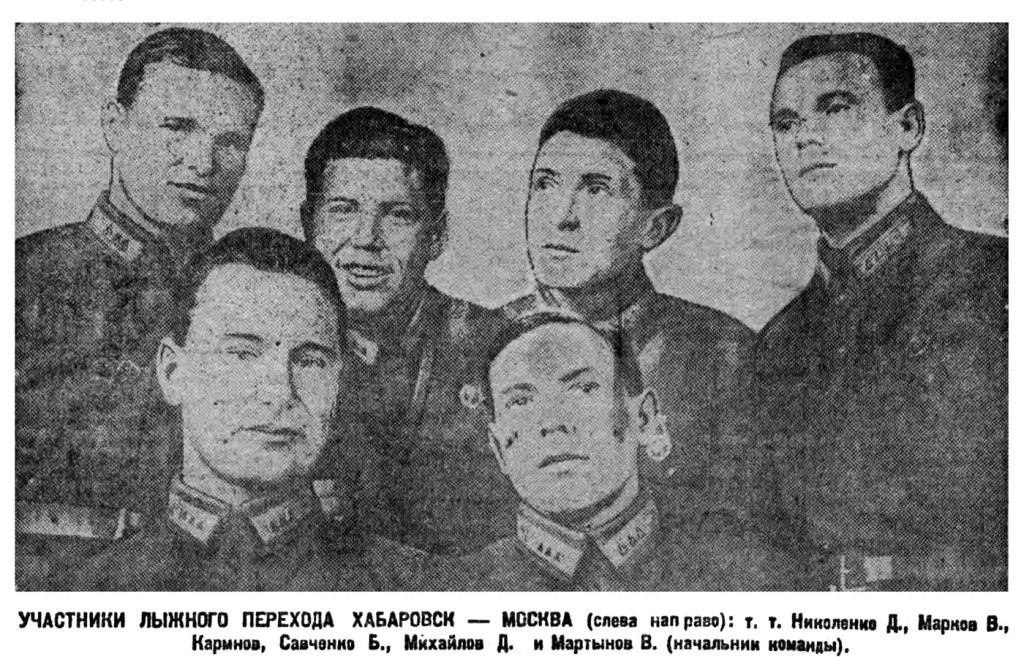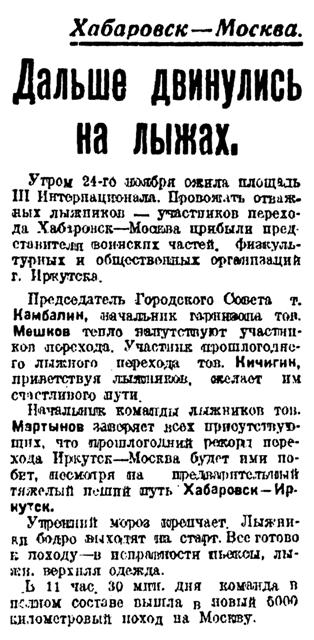 Вчера в 2 часа дня в Иркутск прибыли участники большого лыжного перехода Хабаровск — Москва — шесть командиров №-ской части ОКДВА: тт. Мартынов, В., Марков В., Николенко Д., Савченко В., Кармнов А. и Михайлов Д.