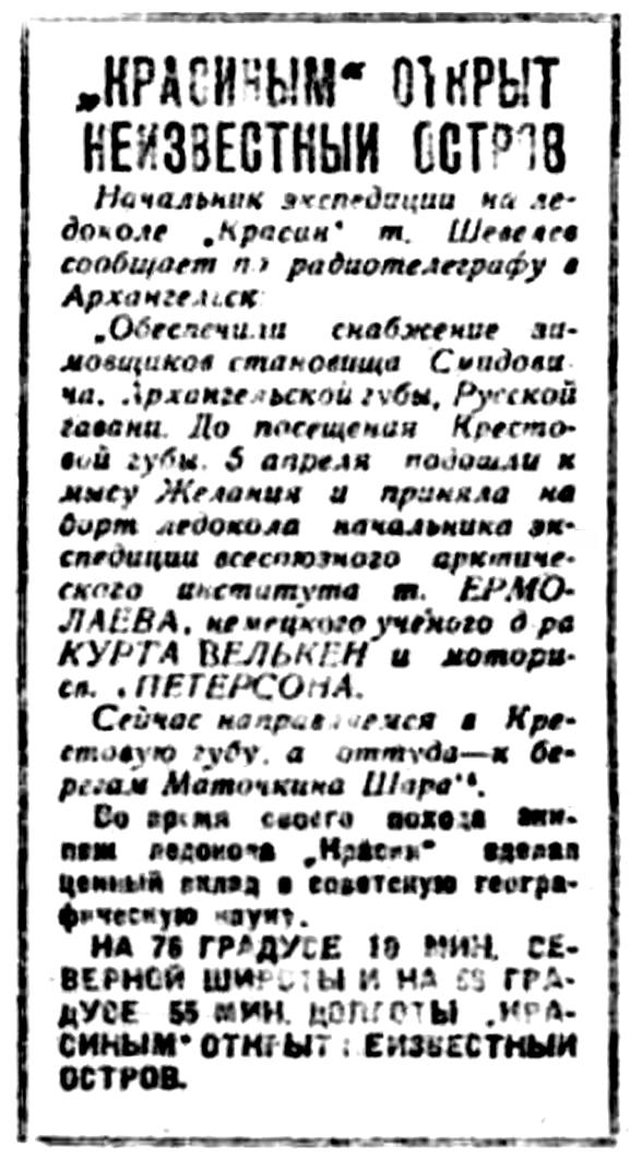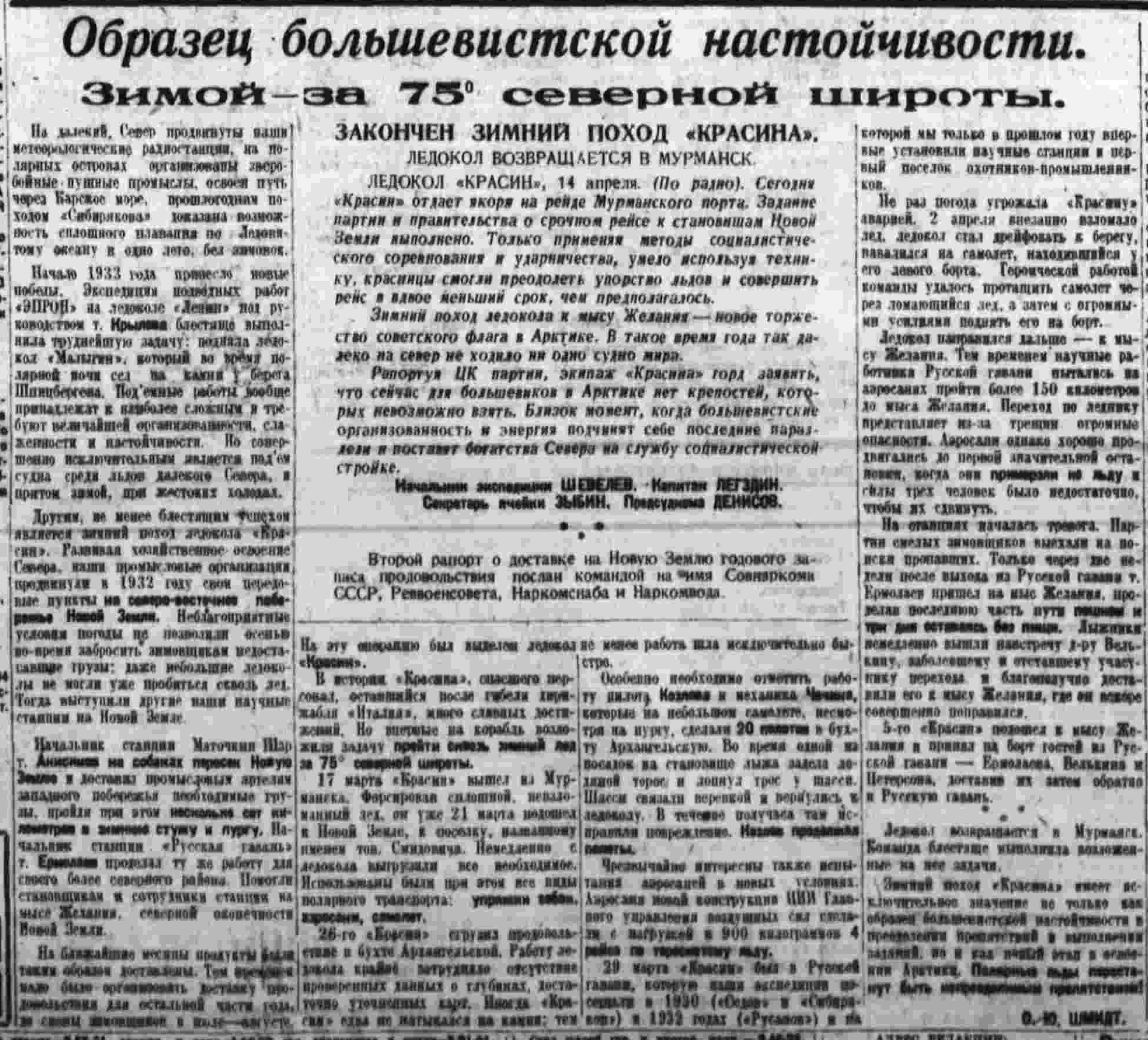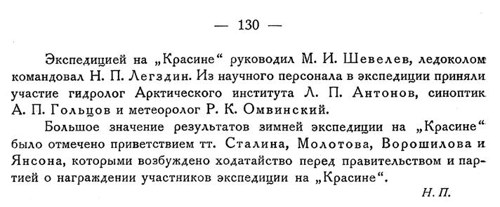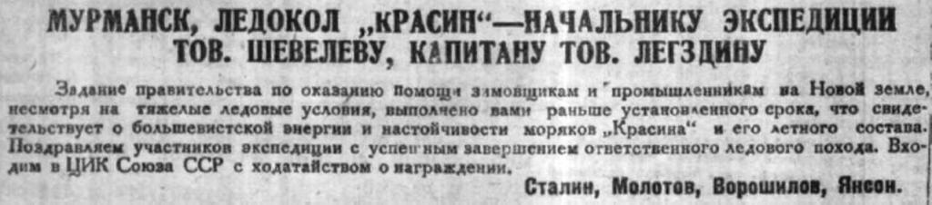Большое значение результатов зимней экспедиции на „Красине“ было отмечено приветствием тт. Сталина, Молотова, Ворошилова и Янсона, которыми возбуждено ходатайство перед правительством и партией о награждении участников экспедиции на „Красине".