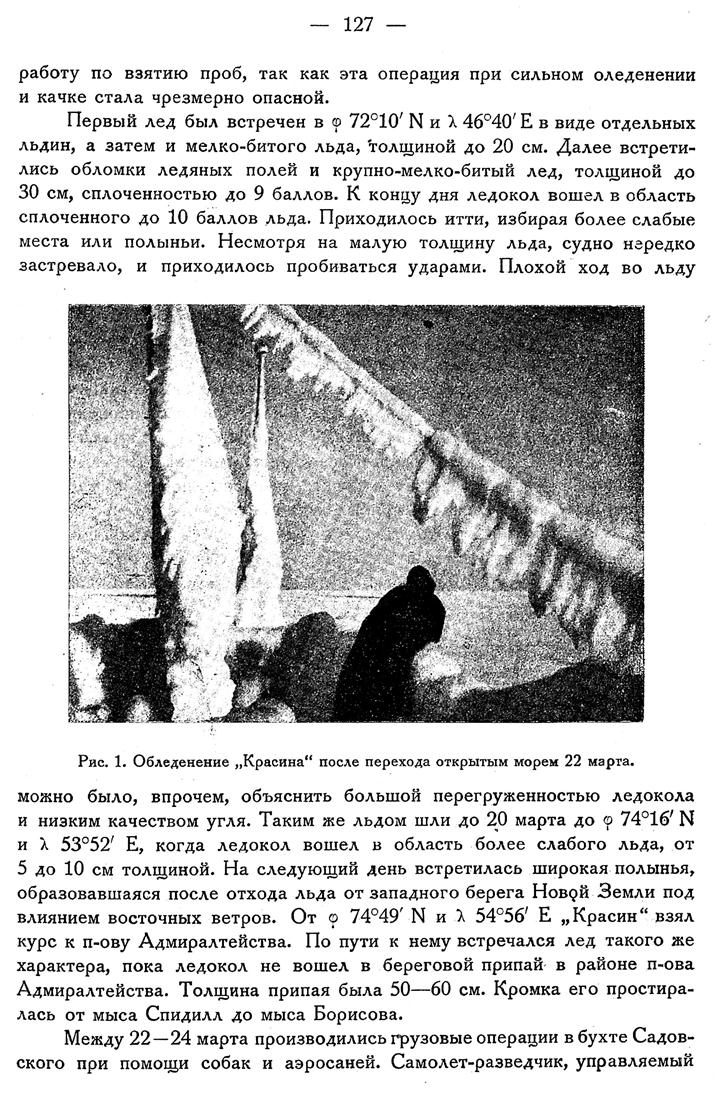 Успех рейса не может, разумеется, быть отнесен целиком за счет мощности судна. Этот успех объясняется с одной стороны общеблагоприятным состоянием льдов в Баренцовом море в последние годы, а с другой стороны изумительной спаянностью работников экспедиции и выдающимся смелым руководством ею. Тем не менее рассмотрение деталей плавания „Красина“ в 1932 {1} и 1933 гг. приводит к заключению, что дальнейшее изучение расположения льдов по площади Баренцова моря в зимнее время может привести к установлению некоторых благоприятных факторов, которые возможно будет использовать как для дальнейшего изучения гидрологического режима Баренцова моря в течение круглого года, так и в практических целях.