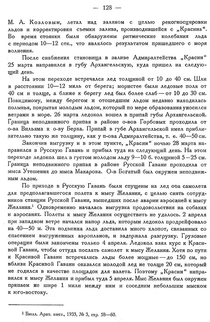 По приходе в Русскую Гавань были спущены на лед оба самолета для предполагавшегося полета к мысу Желания, с целью снять сотрудников станции Русской Гавани, вышедших после аварии аэросаней к мысу Желания. {1} Одновременно началась выгрузка продовольствия на собаках и аэросанях. Полеты к мысу Желания осуществить не удалось. 2 апреля при западном ветре начался напор льда, которым ледокол продрейфовало на 40—50 м. Эта подвижка льда доставила много хлопот, связанных со спасением выгруженных аэропланов, и задержала разгрузку. Грузовые операции были закончены только 4 апреля. Ледокол взял курс к Красивой Гавани, чтобы оттуда послать самолет к мысу Желания. Хотя по пути к Красивой Гавани встречались льды более мощные — до 150 см, но вблизи Красивой Гавани оказался молодой лед не толще 20 см, который не годился в качестве площадок для взлета. Поэтому „Красин“ направился к мысу Желания и прибыл туда 5 апреля. Мыс Желания был окружен припаем не шире 1 мили между ним и соседним небольшим мыском к юго-востоку.