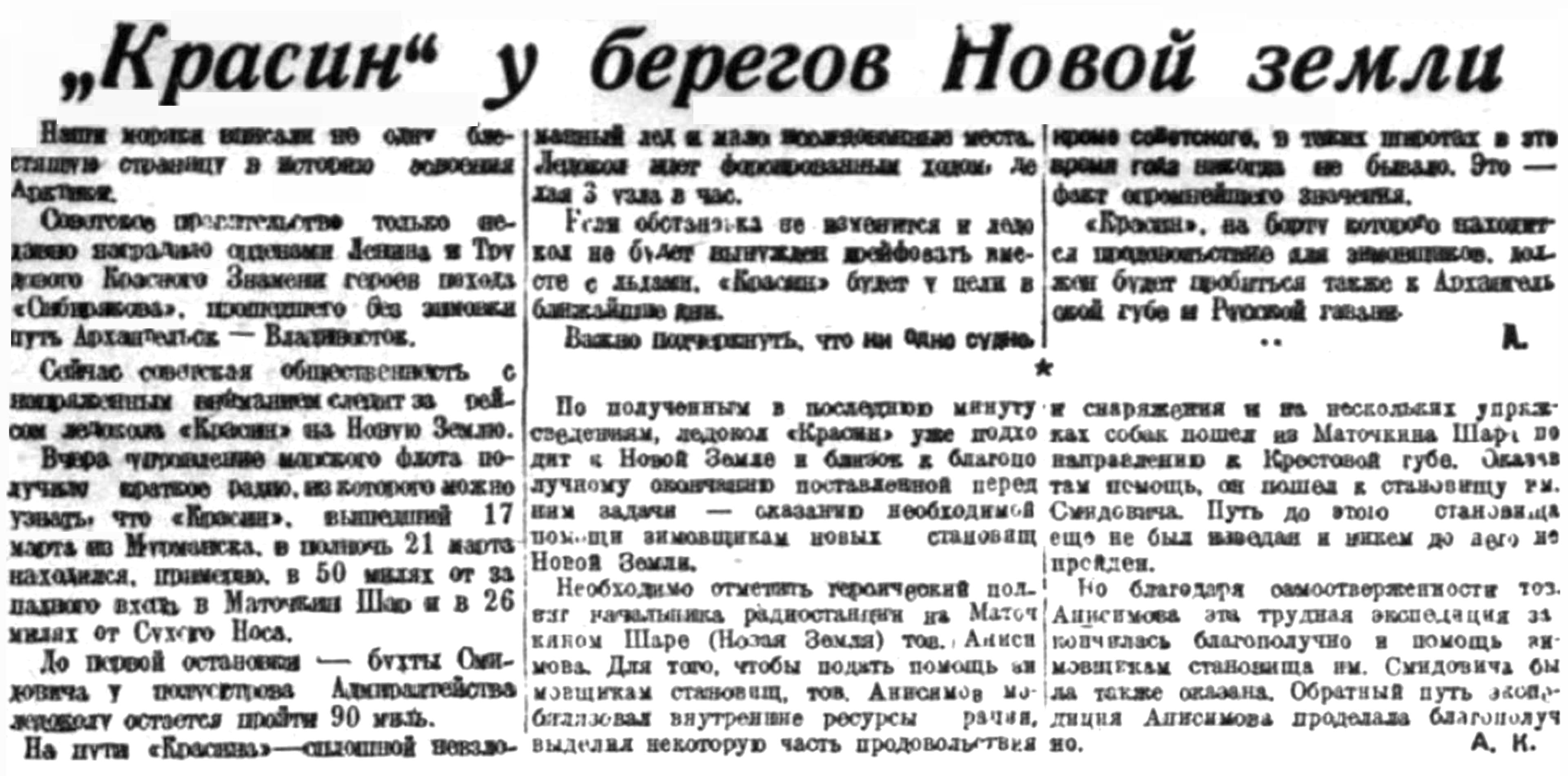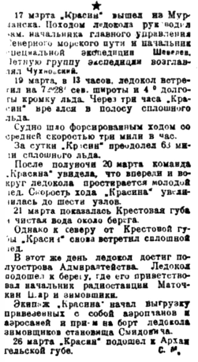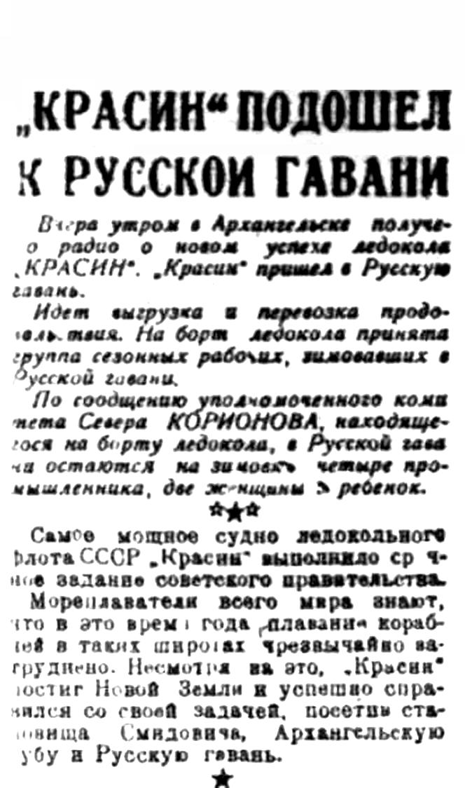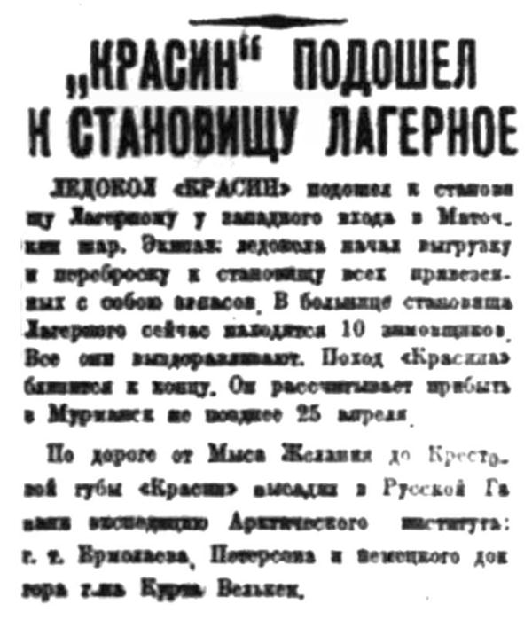После снабжения cтановища в заливе Адмиралтейства „Красин“ 25 марта направился в губу Архангельскую, куда пришел на следующий день.