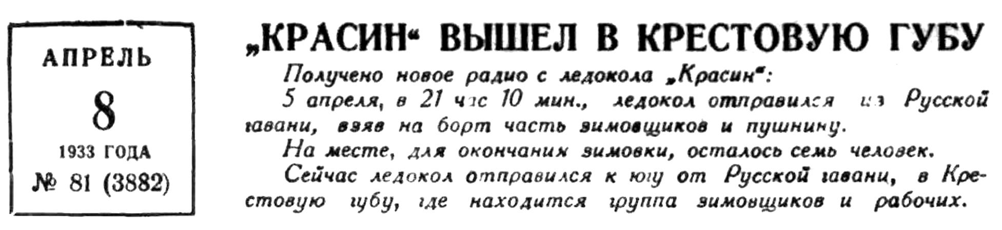 Приняв на борт сотрудников Русской Гавани М. М. Ермолаева, д-ра Вёлькена и В. Э. Петерсена, „Красин" направился вновь к Русской Гавани. На этом переходе ледокол был зажат в торосистом льду в течение восьми часов; освободиться удалось только при помощи взрывов аммонала. Еще четыре часа были потрачены на попытки выйти из тесного льда на свободную воду. После недолгой остановки 7 апреля, для высадки людей в Русской Гавани, ледокол направился в Крестовую губу. Лед на этом переходе был в таком же состоянии, как при рейсе к северу. Войдя в припай губы Крестовой 8 апреля, два следующие дня