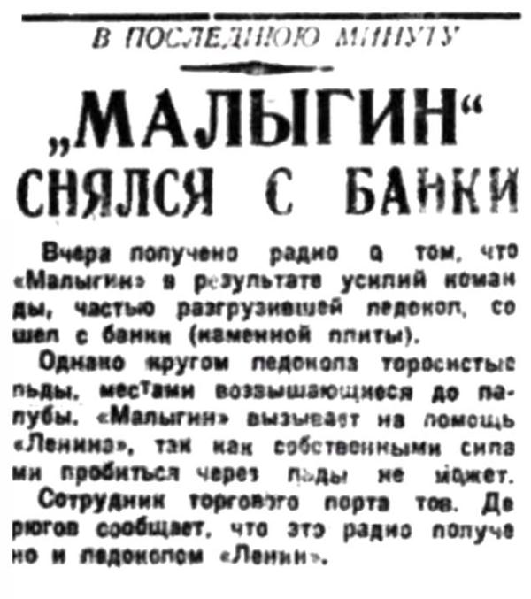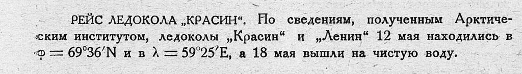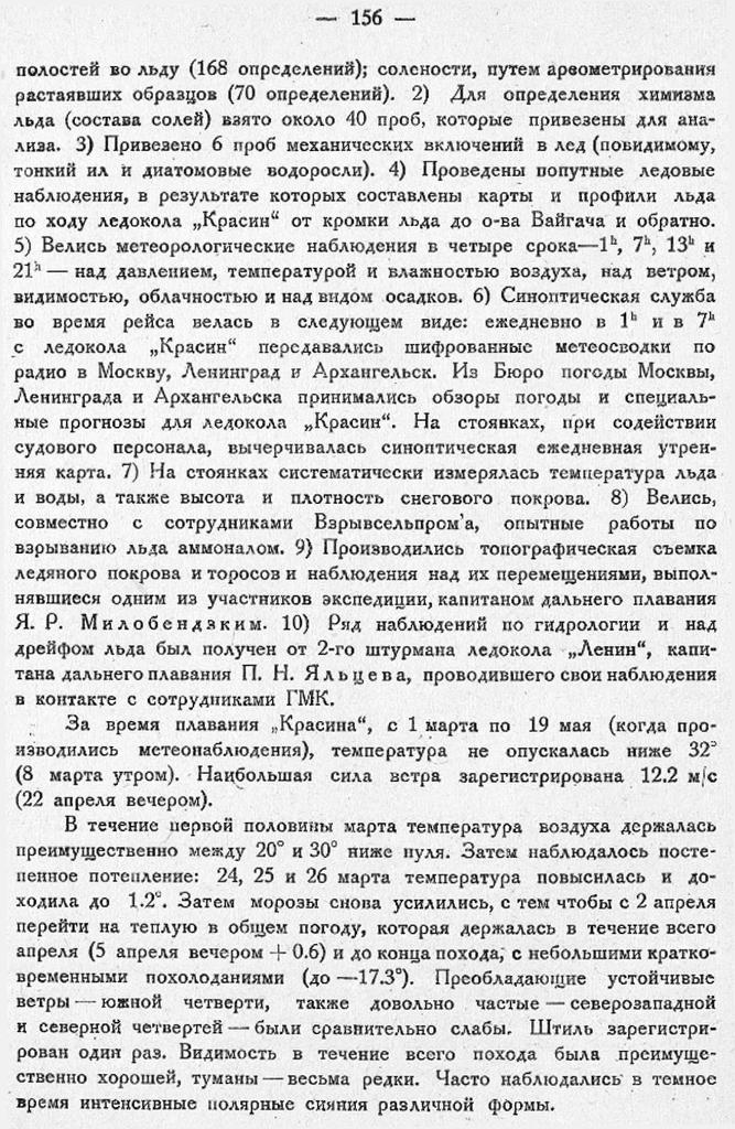 полостей во льду (168 определений); солености, путем ареометрирования растаявших образцов (70 определений). 2) Для определения химизма льда (состава солей) взято около 40 проб, которые привезены для анализа. 3) Привезено 6 проб механических включений в лед (повидимому, тонкий ил и диатомовые водоросли). 4) Проведены попутные ледовые наблюдения, в результате которых составлены карты и профили льда по ходу ледокола „Красин" от кромки льда до о-ва Вайгача и обратно. 5) Велись метеорологические наблюдения в четыре срока — 1h, 7h, 13h и 21h — над давлением, температурой и влажностью воздуха, над ветром, видимостью, облачностью и над видом осадков. 6) Синоптическая служба во время рейса велась в следующем виде: ежедневно в 1h и в 7h с ледокола „Красин” передавались шифрованные метеосводки по радио в Москву, Ленинград и Архангельск. Из Бюро погоды Москвы, Ленинграда и Архангельска принимались обзоры погоды и специальные прогнозы для ледокола „Красин". На стоянках, при содействии судового персонала, вычерчивалась синоптическая ежедневная утренняя карта. 7) На стоянках систематически измерялась температура льда и воды, а также высота и плотность снегового покрова. 8') Велись совместно с сотрудниками Взрывсельпром’а, опытные работы по взрыванию льда аммоналом. 9) Производились топографическая съемка ледяного покрова и торосов и наблюдения над их перемещениями, выполнявшиеся одним из участников экспедиции, капитаном дальнего плавания Я. Р. Милобендзким. 10) Ряд наблюдений по гидрологии и над дрейфом льда был получен от 2-го штурмана ледокола „Ленин", капитана дальнего плавания П. Н. Яльцева, проводившего свои наблюдения в контакте с сотрудниками ГМК.
