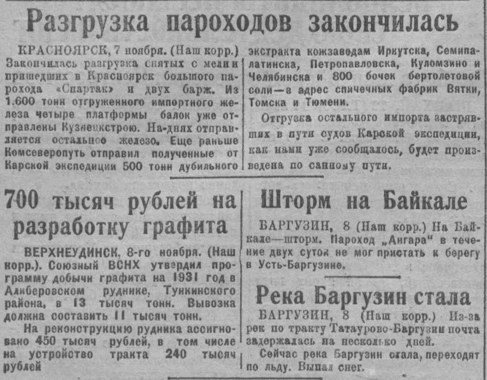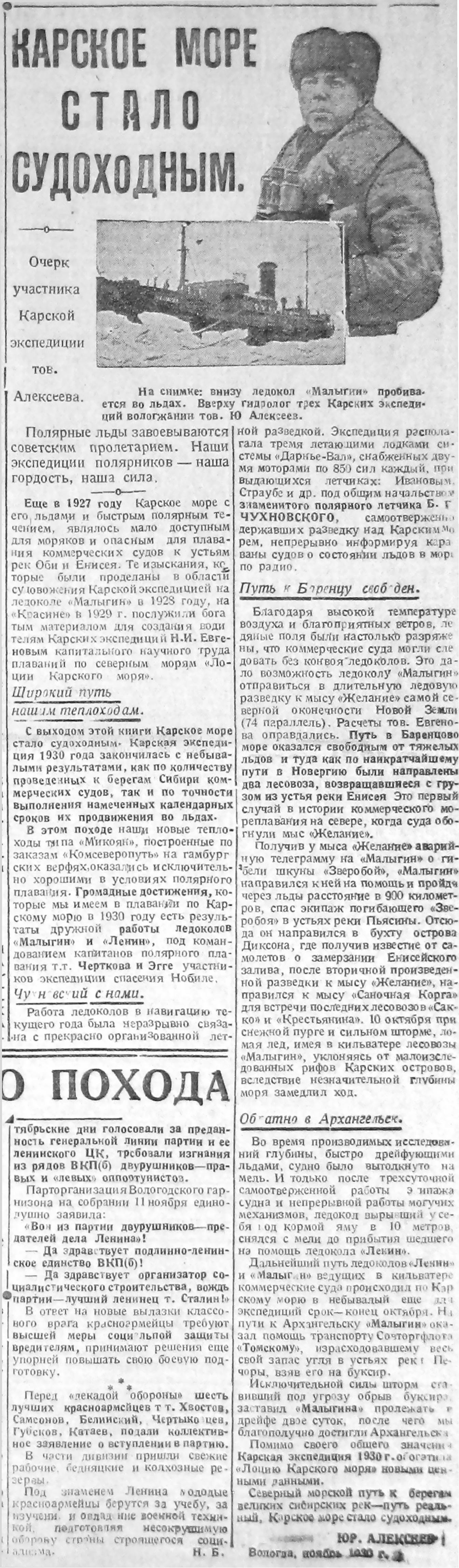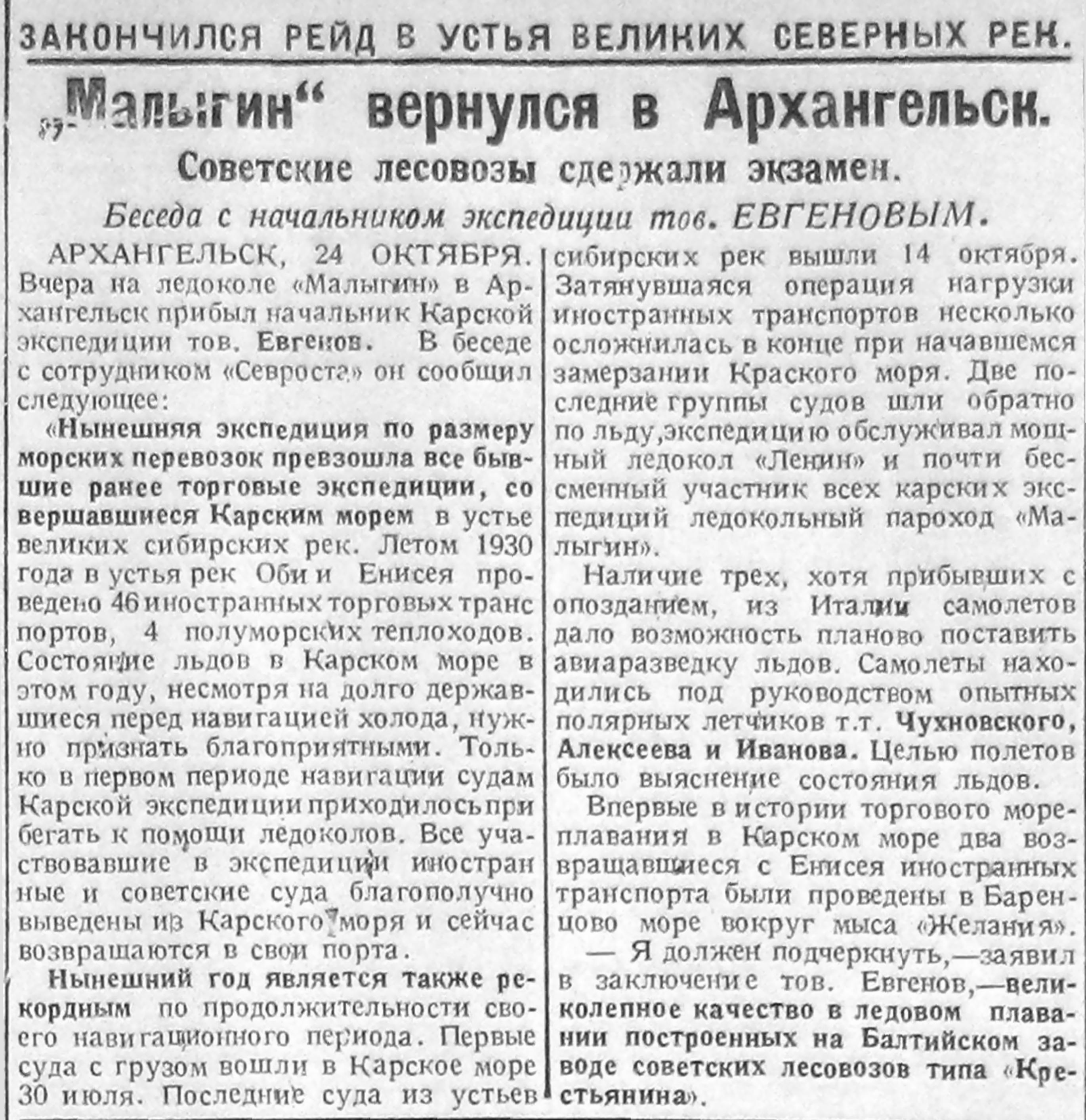 {1} О Карской экспедиции 1930 г. см. Отчет по Карской экспедиции 1930 г. (ЦА ММФ, ф. а/о «Комсеверопуть», оп. 1, д. 397; Н. И. Евгенов. Предварительный отчет начальника морской части Карской операции о научно-исследовательских работах, производившихся на борту ледокольного парохода «Малыгин» в навигацию 1930 г., (ЦА ММФ, ф. а/о «Комсеверопуть», оп. 1, д. 317). Н. И. Евгенов. Карские морские экспедиции на новом этапе. «Морской сборник», 1931, № 1; Отчет о работе акционерного общества «Комсеверопуть» за 1930 г. (Архив МВТ СССР, ф. КСМП, оп. 5574, Д. 4).