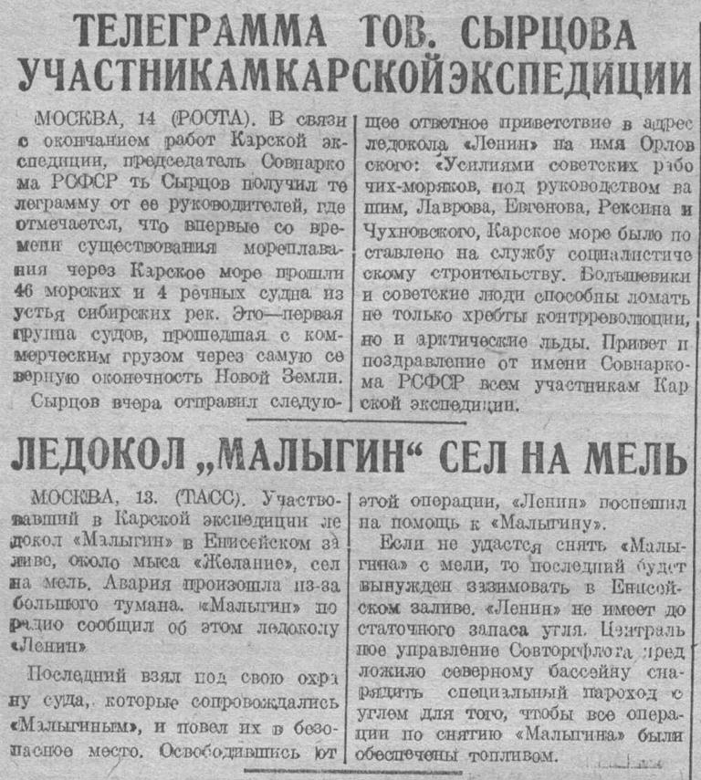 управления были сооружены две новые радиостанции: одна на мысе Желания, другая на острове Белом. На борту ледокольного парохода «Малыгин» находилась научная группа, работа которой обслуживала Карскую экспедицию.