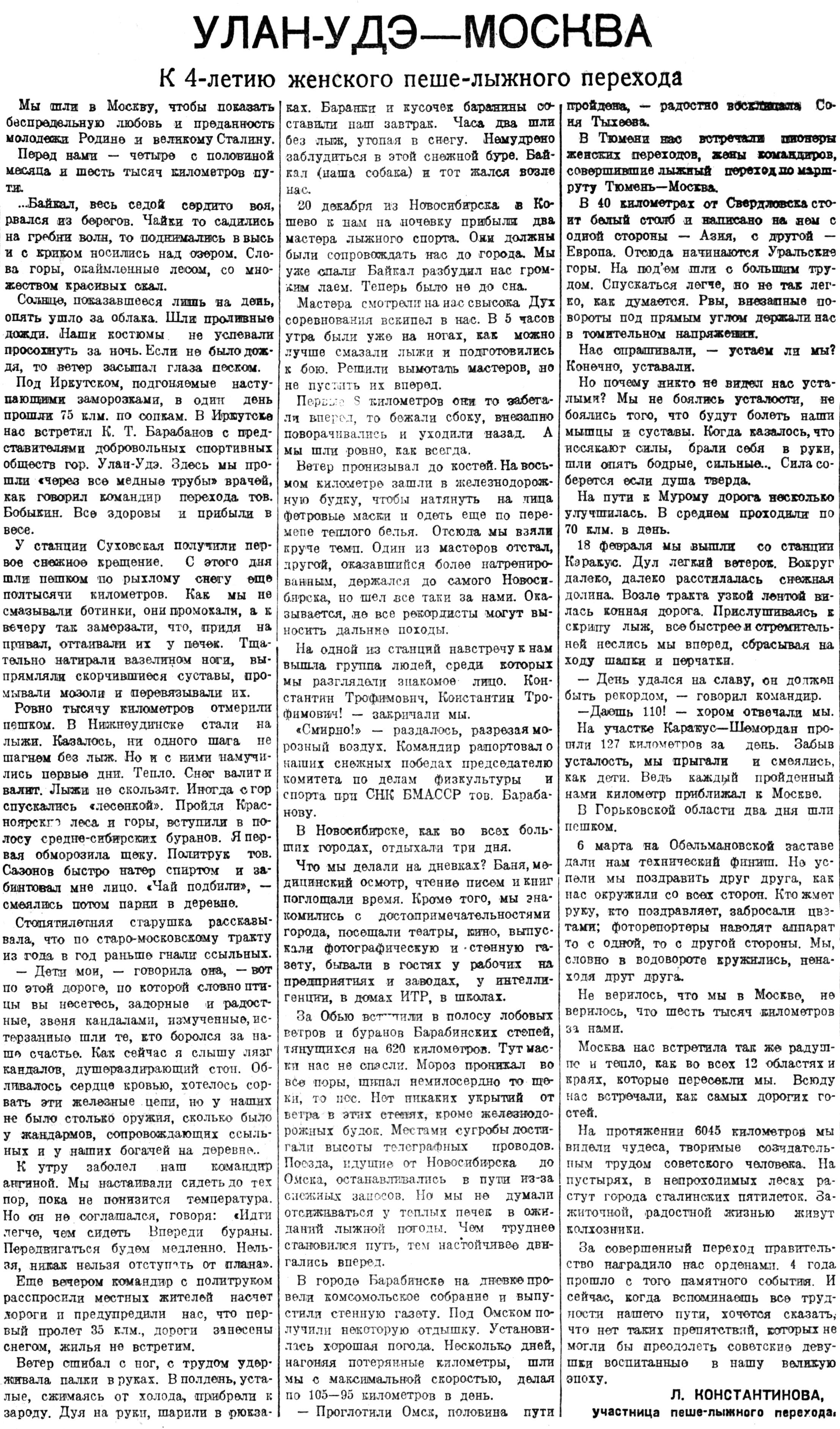А через полтора месяца, в канун нового 1936 года, оставшиеся девушки отправились в первый лыжный, тренировочный поход по маршруту Улан-Удэ - Кяхта - Улан-Удэ. Через десять дней, 10 января, улан-удэнцы торжественно встречали лыжниц. Пройдено ими было 560 километров.