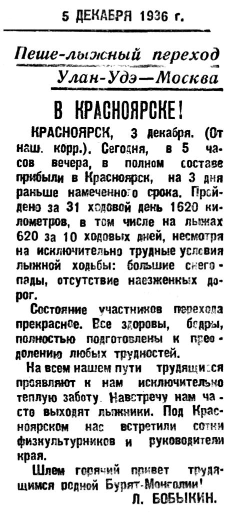 6 декабря участвовали в митинге трудящихся Красноярска, посвященном утверждению Сталинской Конституции. На митинге от нас выступила Лиза Константинова, встреченная аплодисментами и криками «ура». Она передала трудящимся Красноярска пламенный привет от трудящихся Бурят-Монголии и от участников перехода.