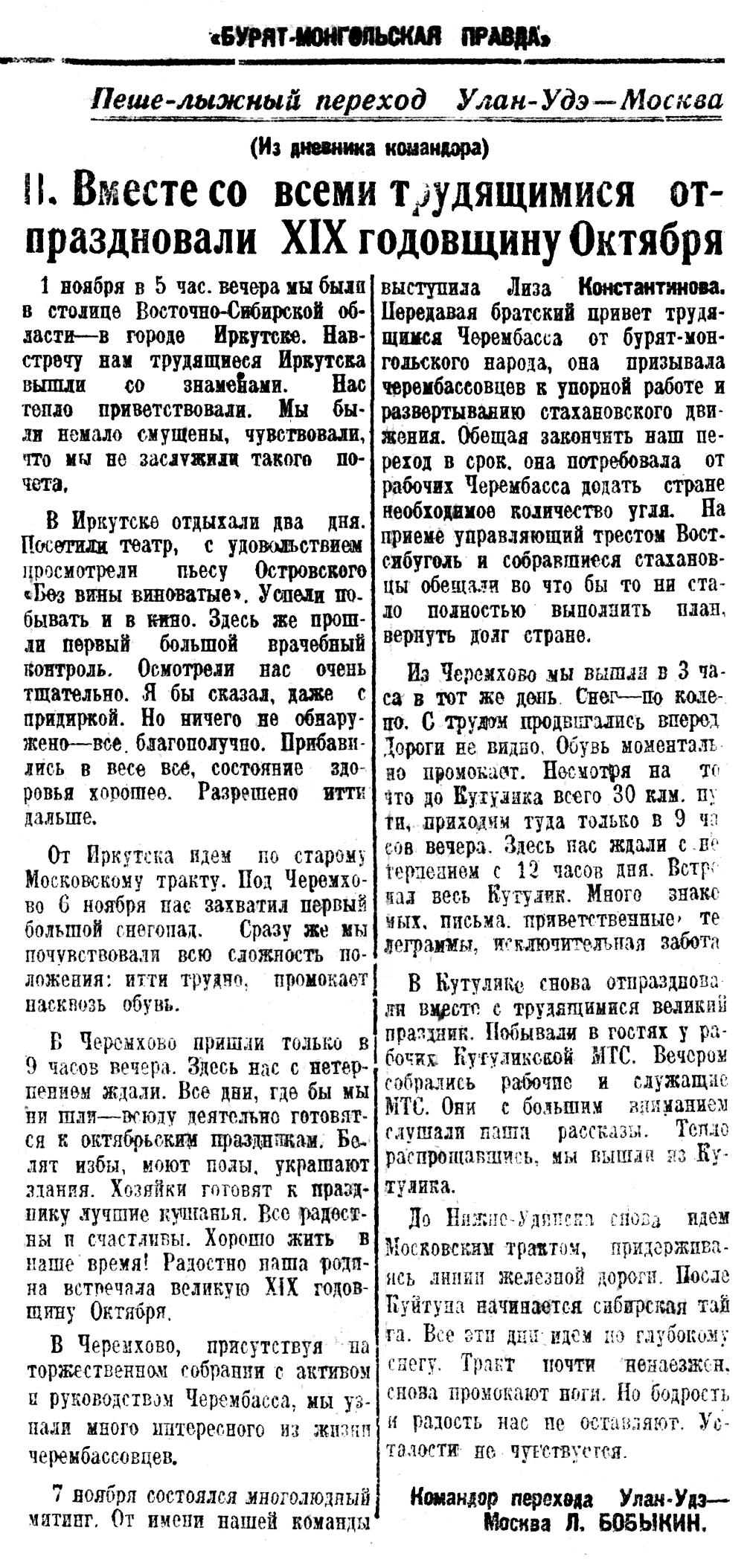 1 ноября были в Иркутске. Октябрьский праздник провели в Черемхово, Зима, Куйтун, Тулун встречали хорошо. За 8 километров до Нижнеудинска над командой появился самолет. Он спустился низко и приветствовал покачиванием крыльев. Здесь же нас засняли кинооператоры.