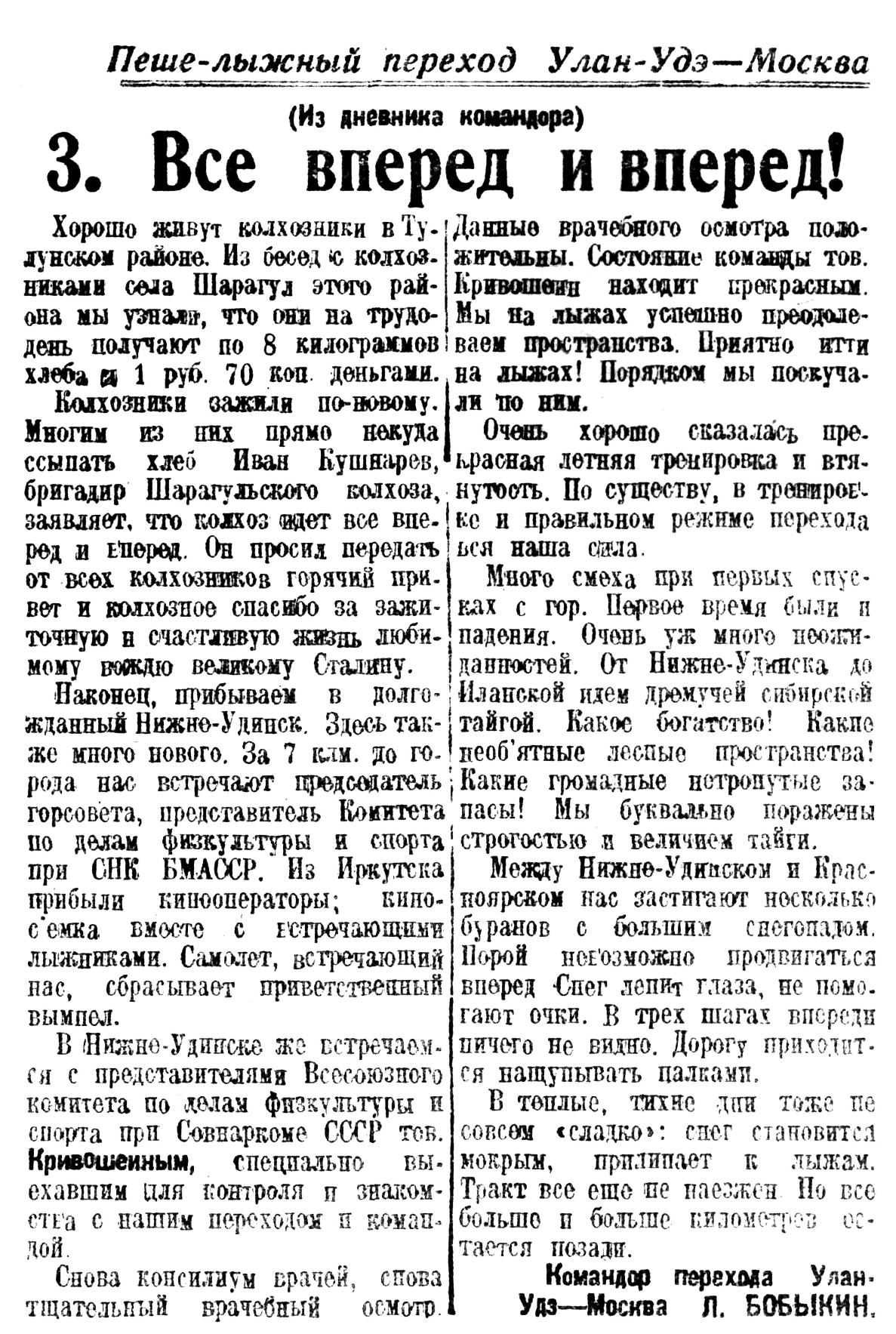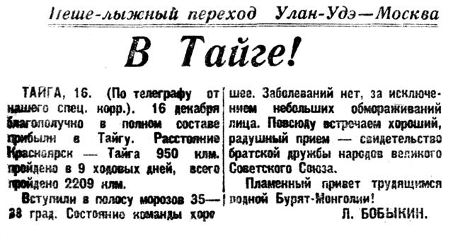 Под Иркутском, подгоняемые наступающими заморозками, в один день прошли 75 клм. по сопкам. В Иркутске нас встретил К. Т. Барабанов с представителями добровольных спортивных обществ гор. Улан-Удэ. Здесь мы прошли «через все медные трубы» врачей, как говорил командир перехода тов. Бобыкин. Все здоровы и прибыли в весе.