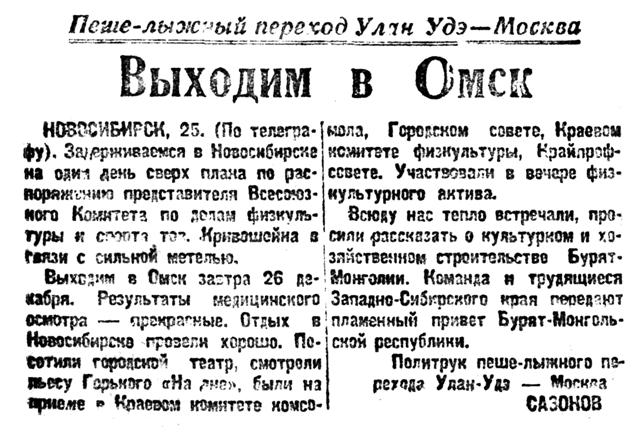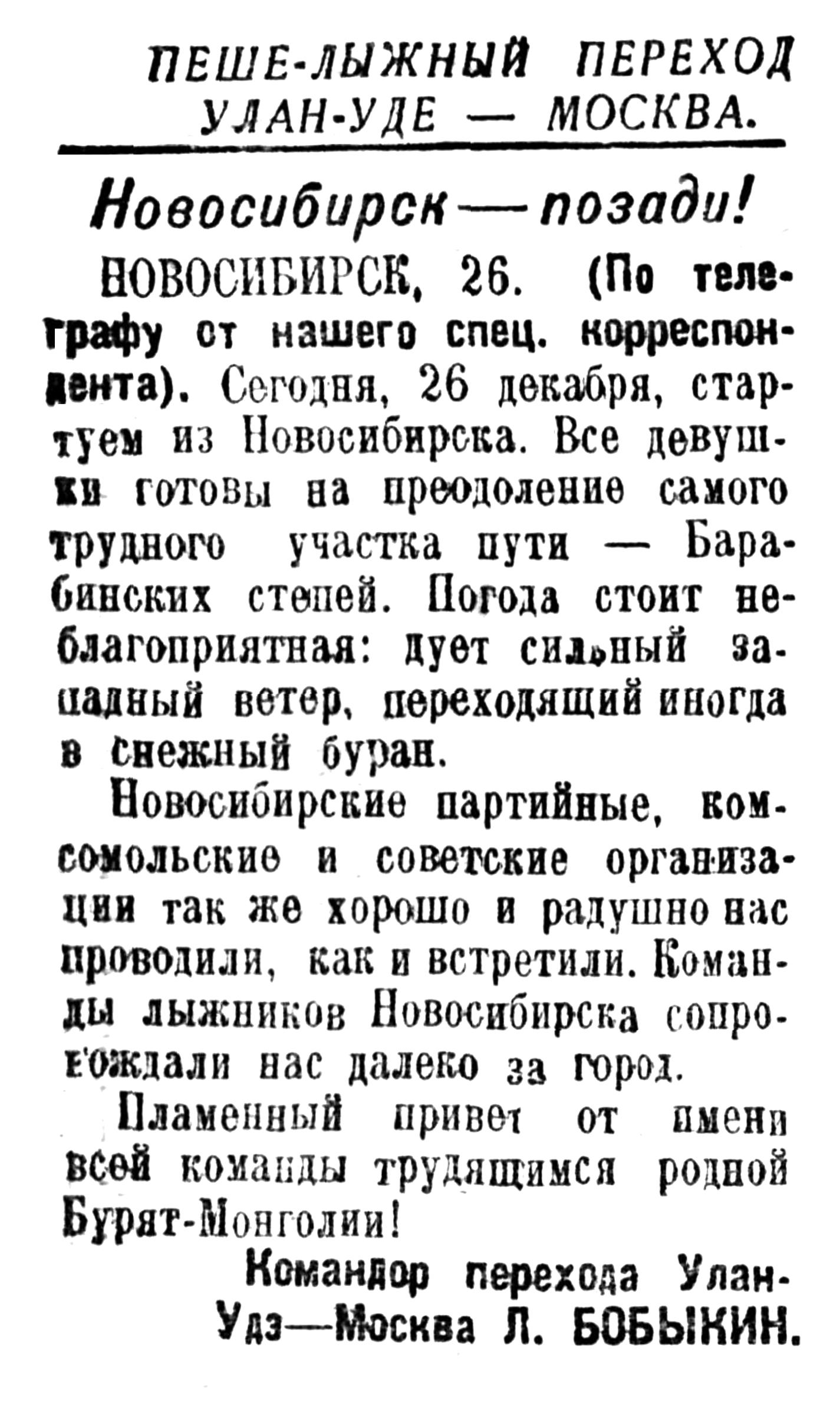 Новосибирск, 22. (По телеграфу от наш. корр.). 21 декабря в 5 часов вечера благополучно в полном составе прибыли в Новосибирск. Сквозь дожди, байкальские ветры, трескучие сибирские морозы, снежные бураны прошли 2500 километров. Самочувствие всех участников перехода прекрасное. Перед Новосибирском нас застиг 40-градусный мороз. Применение специальных масок предохранило от обмораживаний. Всюду трудящиеся нам оказывают теплый прием. В Красноярске принимали участие в соревновании в честь принятия Сталинской Конституции.