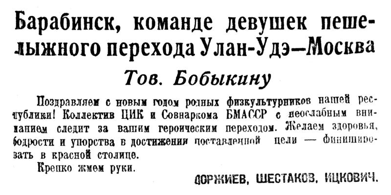 Поздравляем с новым годом родных физкультурников нашей республики! Коллектив ЦИК и Совнаркома БМАССР в неослабным вниманием следит за вашим героическим переходом. Желаем здоровья, бодрости и упорства в достижения поставленной цели — финишировать в красной столице.