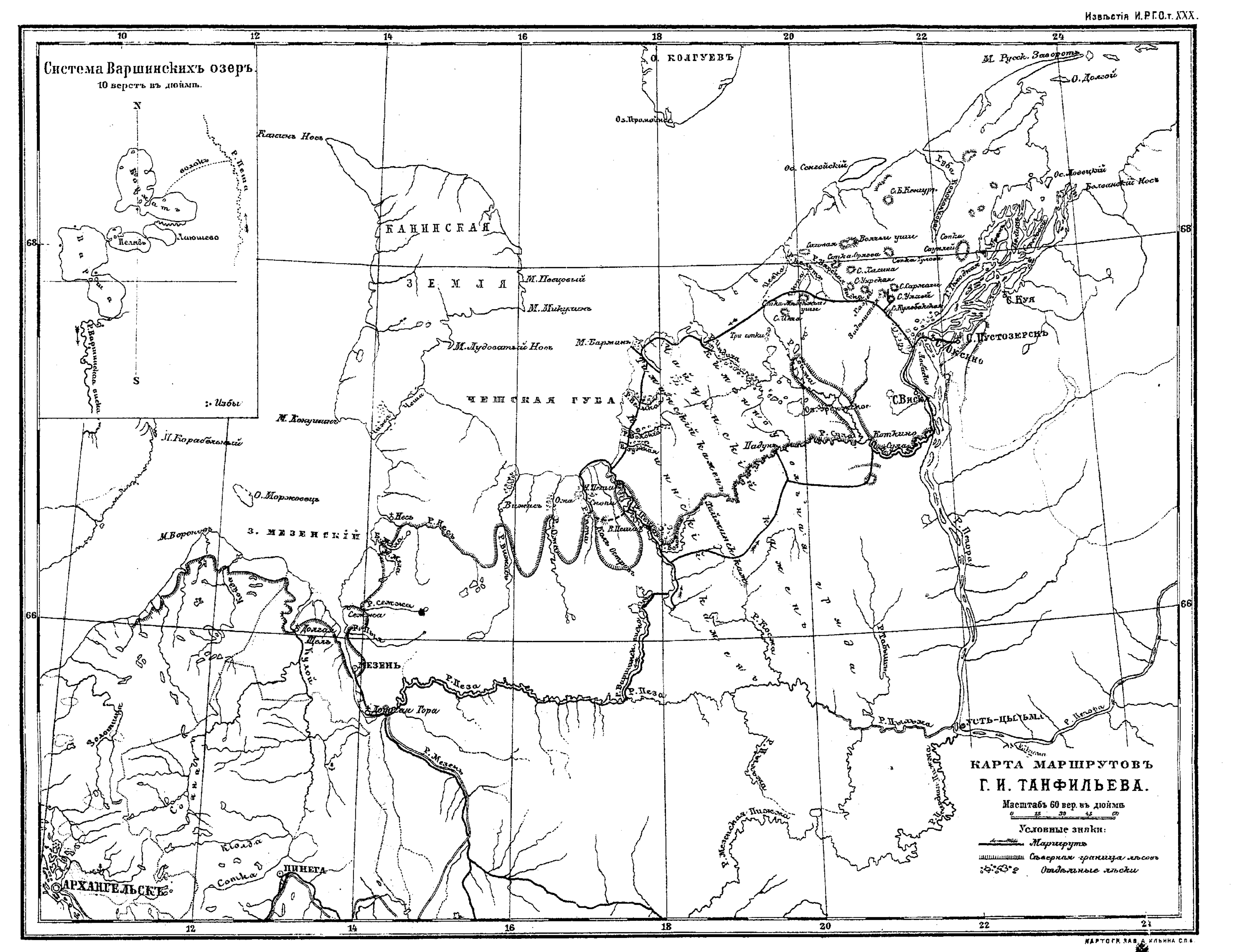 Исходным пунктом путешествия Гавриил Иванович избрал город Мезень. От Мезени он проехал в лодке по реке Пезе до реки Варшинской, по которой поднялся до системы Варшинских озер. Система Варшинских озер, лежащая на лесистом водоразделе Пезы и Чешской губы, состоит из четырех крупных, живописных озер и целого ряда более мелких. Отсюда, на оленях, он проехал в Пешу. Ознакомившись с тундрою, расположенной к западу от реки Пеши, Танфильев отправился к Пустозерску, на реке Печоре, следуя вдоль южной границы тундры. Обратный путь Танфильева от Печоры до Пеши лежал много севернее, вдоль морского побережья. Таким образом он охватил своими исследованиями разнообразные местности европейских тундр. Из Пеши он прежним путем добрался до Мезени.