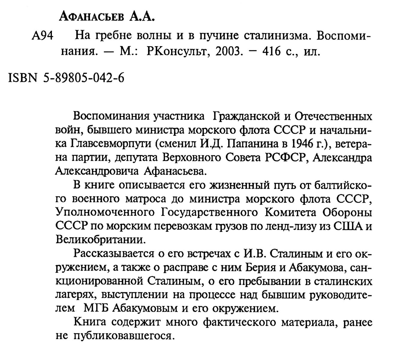 Воспоминания участника Гражданской и Отечественных войн, бывшего министра морского флота СССР и начальника Главсевморпути (сменил И. Д. Папанина в 1946 г. ), ветерана партии, депутата Верховного Совета РСФСР, Александра Александровича Афанасьева. В книге описывается его жизненный путь от балтийского военного матроса до министра морского флота СССР, Уполномоченного Государственного Комитета Обороны СССР по морским перевозкам грузов по ленд-лизу из США и Великобритании. Рассказывается о его встречах с И. В. Сталиным и его окружением, а также о расправе с ним Берия и Абакумова, санкционированной Сталиным, о его пребывании в сталинских лагерях, выступлении на процессе над бывшим руководителем МГБ Абакумовым и его окружением. Книга содержит много фактического материала, ранее не публиковавшегося.