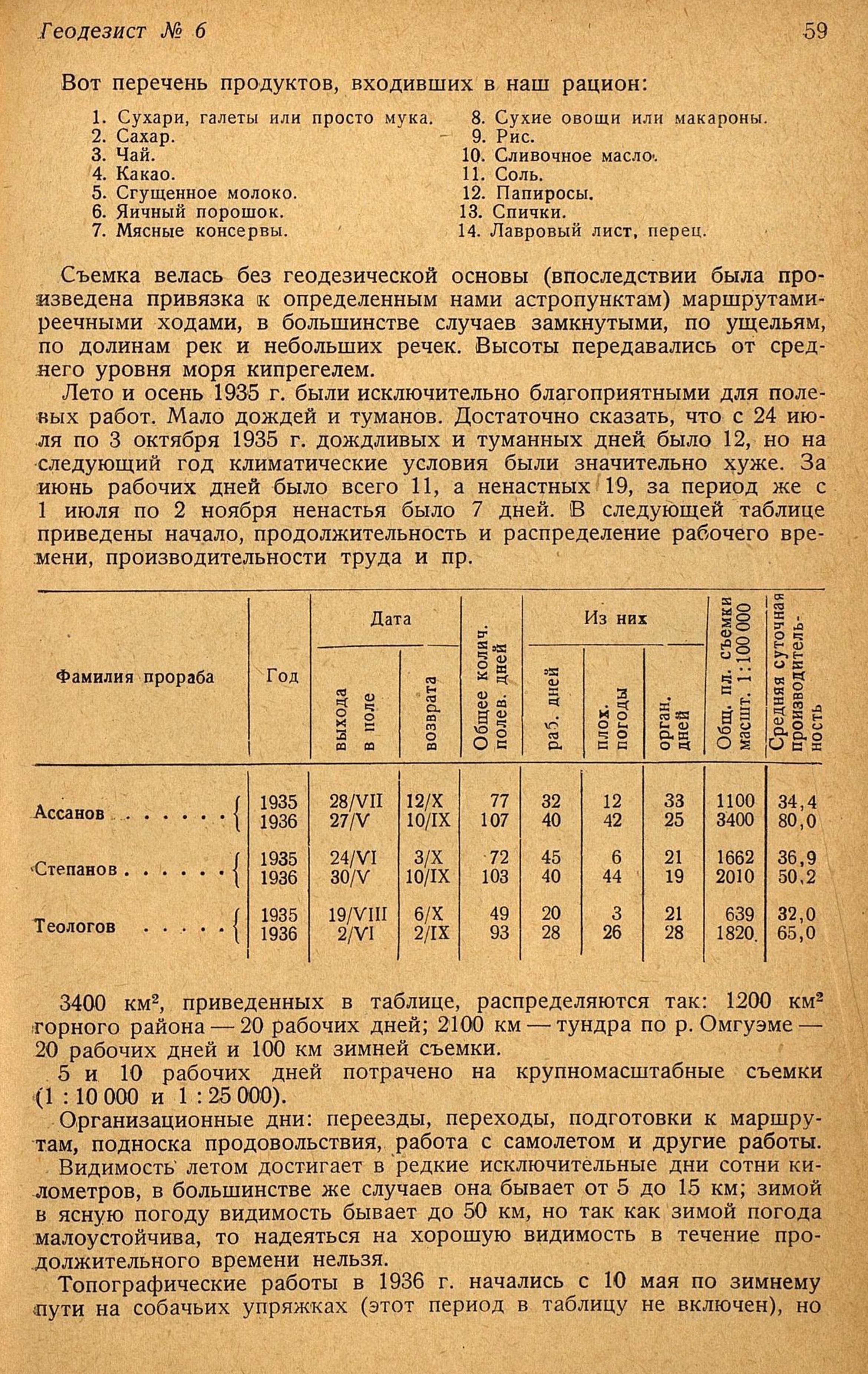 Топографические работы в 1936 г. начались с 10 мая по зимнему пути на собачьих упряжках (этот период в таблицу не включен), но