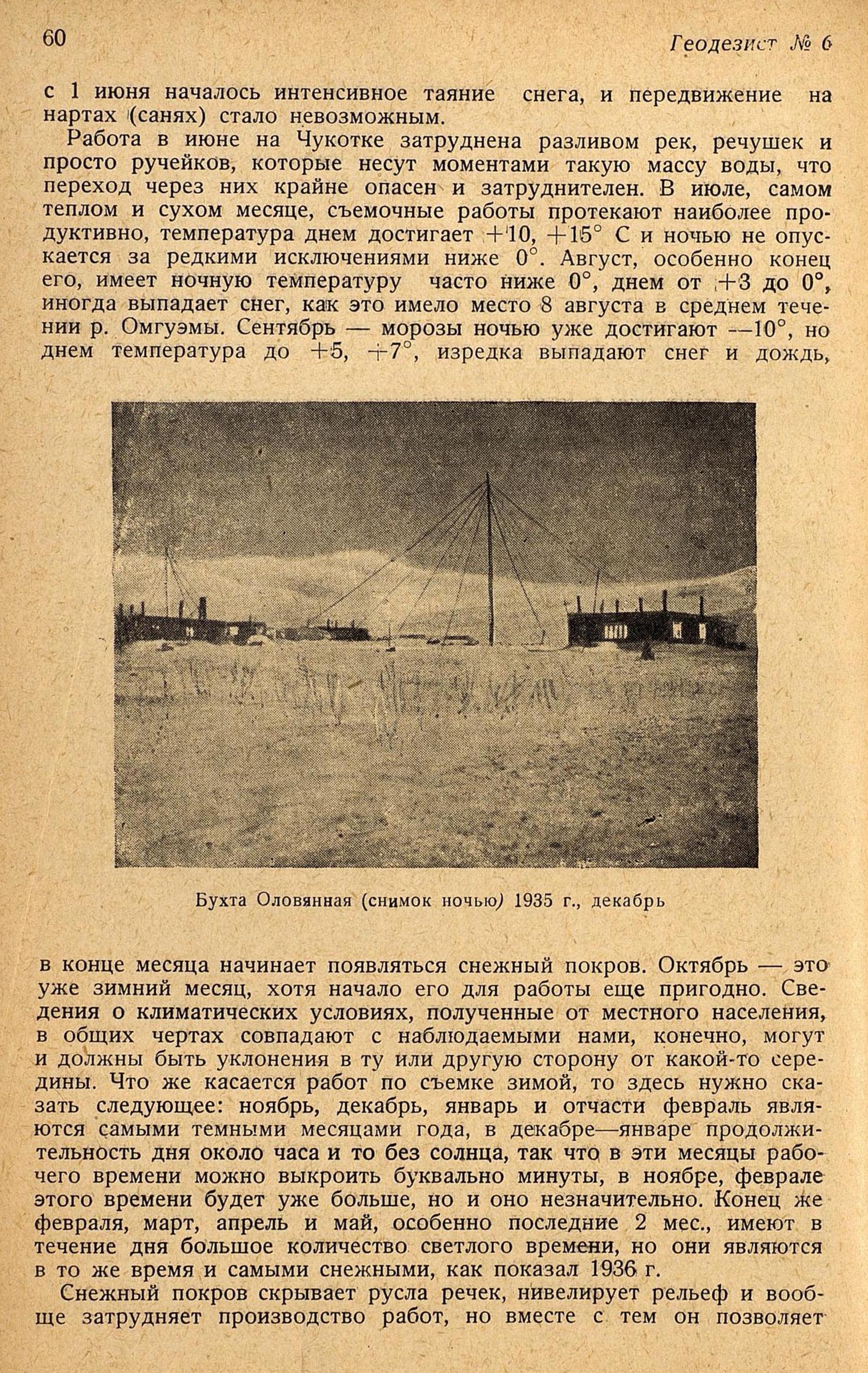 в конце месяца начинает появляться снежный покров. Октябрь — это уже зимний месяц, хотя начало его для работы еще пригодно. Сведения о климатических условиях, полученные от местного населения, в общих чертах совпадают с наблюдаемыми нами, конечно, могут и должны быть уклонения в ту или другую сторону от какой-то середины. Что же касается работ по съемке зимой, то здесь нужно сказать следующее: ноябрь, декабрь, январь и отчасти февраль являются самыми темными месяцами года, в декабре—январе продолжительность дня около часа и то без солнца, так что в эти месяцы рабочего времени можно выкроить буквально минуты, в ноябре, феврале этого времени будет уже больше, но и оно незначительно. Конец же февраля, март, апрель и май, особенно последние 2 мес., имеют в течение дня большое количество светлого времени, но они являются в то же время и самыми снежными, как показал 1936 г.