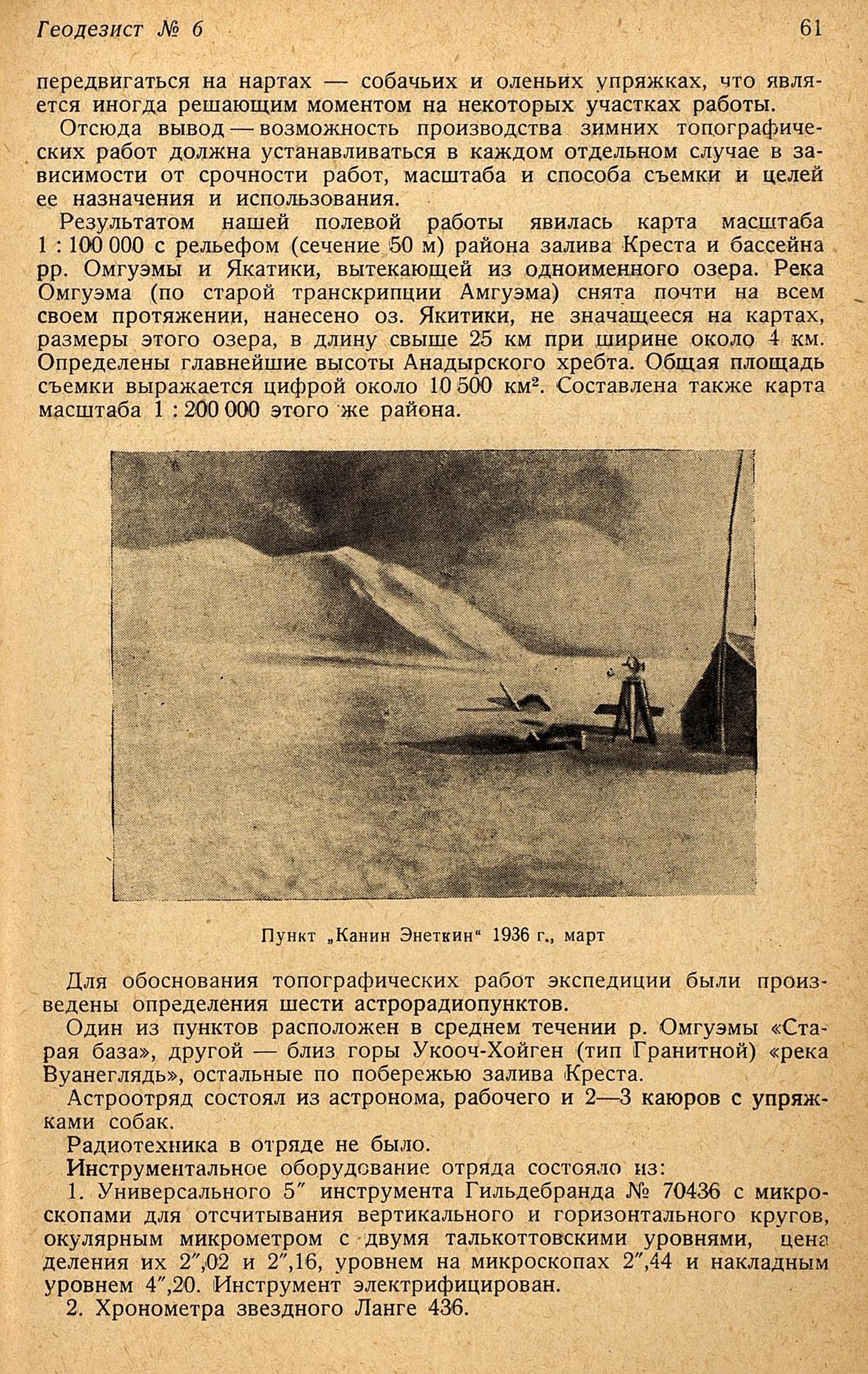 4. Анероида, термометра, бинокля и пр. Наблюдения велись с марта по май 1936 г.; на некоторых пунктах пришлось ожидать благоприятной погоды по нескольку недель; так, на пункте р. Омгуэма — «Старая база», наблюдения велись с 10 апреля по 2 мая, причем, главным образом, работа произведена 1 и 2 мая, остальное время — пурга или закрытое облаками небо.