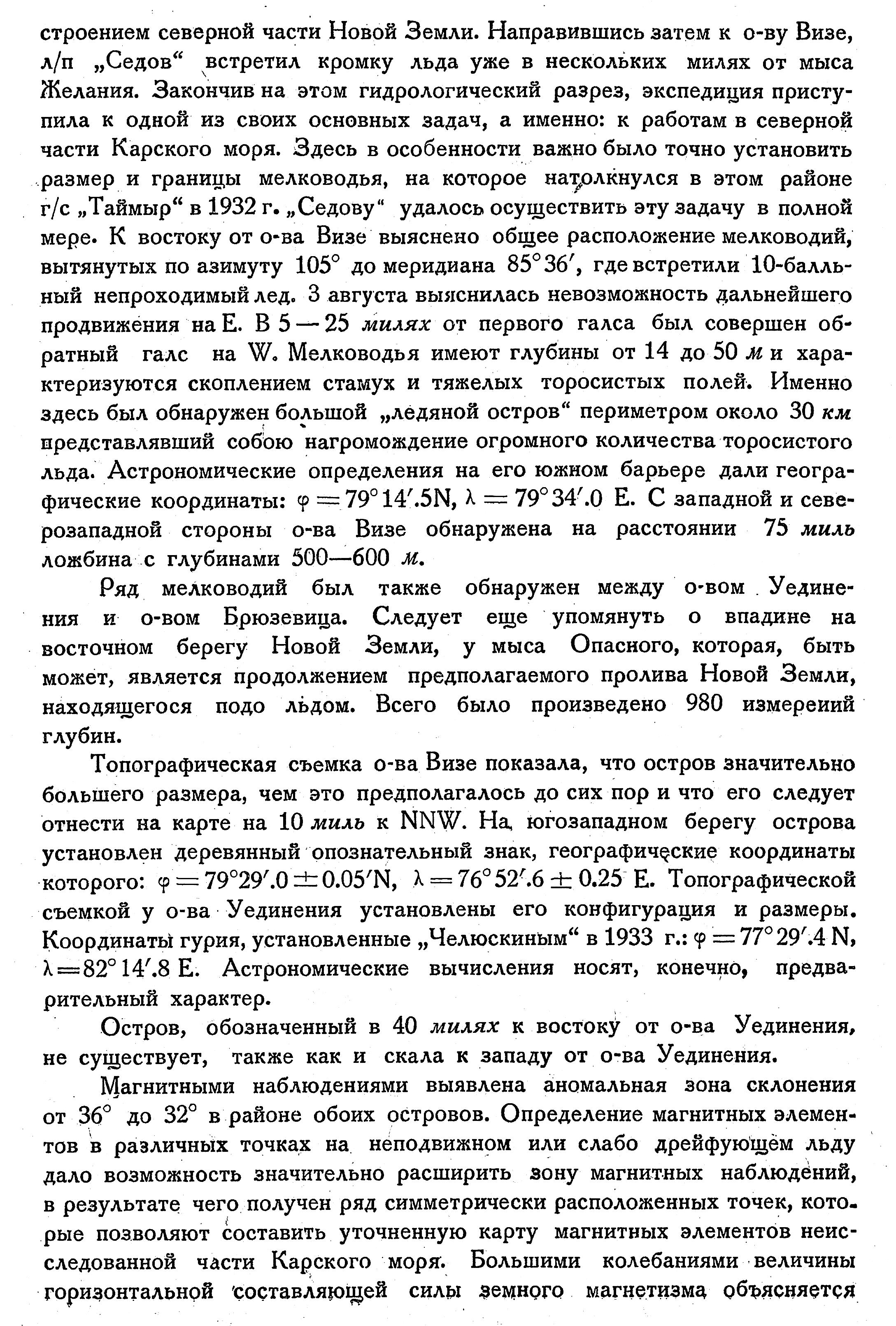 Топографическая съемка о-ва Визе показала, что остров значительно большего размера, чем это предполагалось до сих пор и что его следует отнести на карте на 10 миль к NNW. На, югозападном берегу острова установлен деревянный опознательный знак, географические координаты которого: φ = 79°29'.0 ± 0.05'N, λ = 76° 52'.6 ± 0.25 Е. Топографической съемкой у о-ва Уединения установлены его конфигурация и размеры. Координаты гурия, установленные „Челюскиным“ в 1933 г.: φ = 77° 29'.4 N, λ=82°14'.8Е. Астрономические вычисления носят, конечно, предварительный характер.