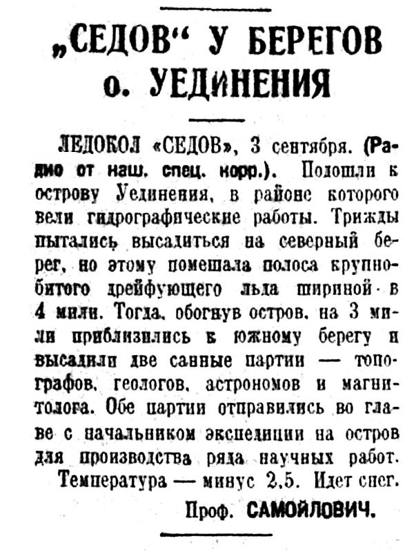 ЛЕДОКОЛ «СЕДОВ», 3 сентября. (Радио от наш. спец. корр.). Подошли к острову Уединения, в районе которого вели гидрографические работы. Трижды пытались высадиться на северный берег, но этому помешала полоса крупнобитого дрейфующего льда шириной в 4 мили. Тогда, обогнув остров, на 3 мили приблизились в южному берегу и высадили две санные партии — топографов, геологов, астрономов и магнитолога. Обе партии отправились во главе с начальником экспедиции на остров для производства ряда научных работ.