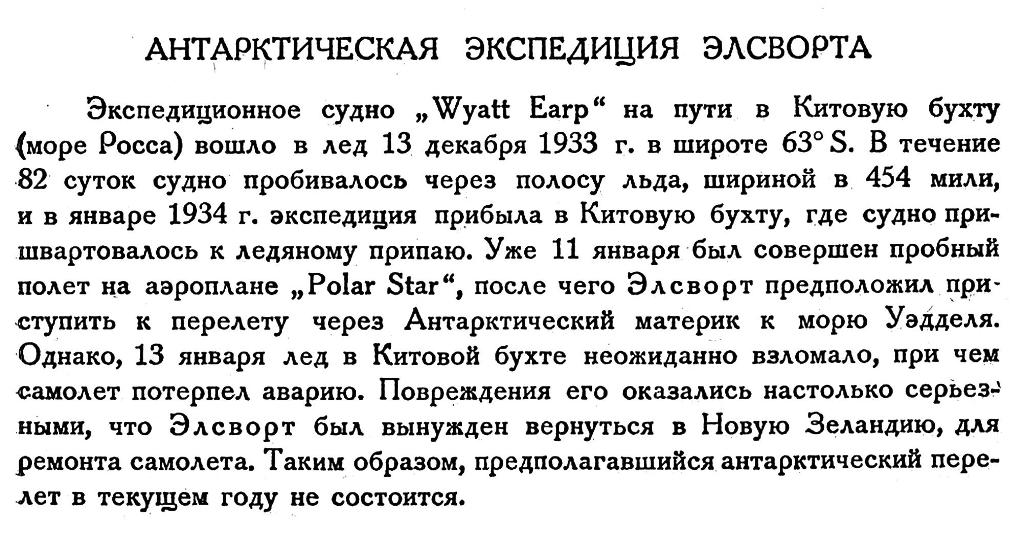 Экспедиционное судно „Wyatt Earp“ на пути в Китовую бухту (море Росса) вошло в лед 13 декабря 1933 г. в широте 63° S. В течение 82 суток судно пробивалось через полосу льда, шириной в 454 мили, и в январе 1934 г. экспедиция прибыла в Китовую бухту, где судно пришвартовалось к ледяному припаю. Уже 11 января был совершен пробный полет на аэроплане „Polar Star", после чего Элсворт предположил приступить к перелету через Антарктический материк к морю Уэдделя. Однако, 13 января лед в Китовой бухте неожиданно взломало, при чем самолет потерпел аварию. Повреждения его оказались настолько серьезными, что Элсворт был вынужден вернуться в Новую Зеландию, для ремонта самолета. Таким образом, предполагавшийся антарктический перелет в текущем году не состоится.