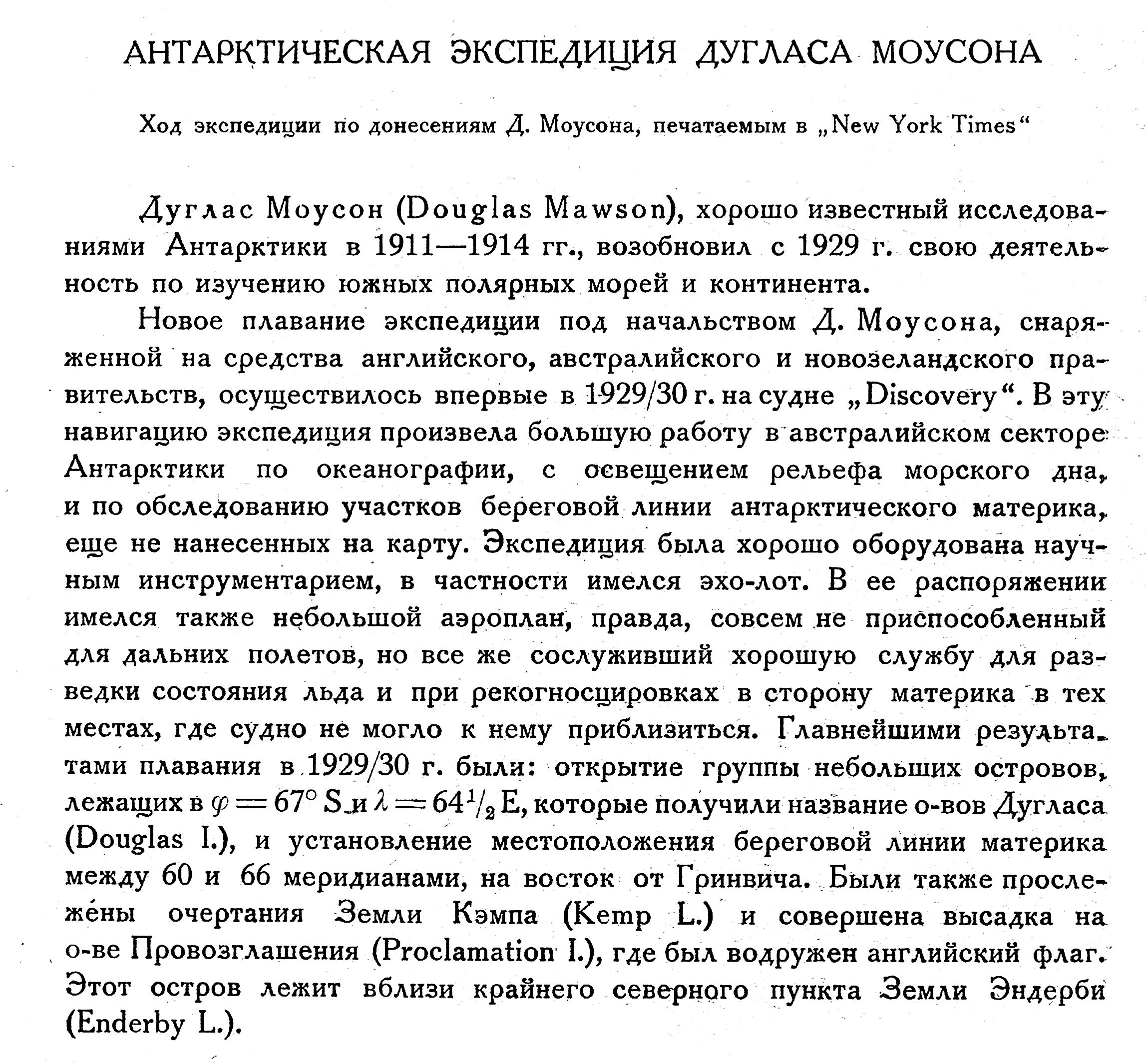 Новое плавание экспедиции под начальством Д. Моусона, снаряженной на средства английского, австралийского и новозеландского правительств, осуществилось впервые в 1929/30 г. на судне „Discovery". В эту навигацию экспедиция произвела большую работу в австралийском секторе Антарктики по океанографии, с освещением рельефа морского дна, и по обследованию участков береговой линии антарктического материка, еще не нанесенных на карту. Экспедиция была хорошо оборудована научным инструментарием, в частности имелся эхо-лот. В ее распоряжении имелся также небольшой аэроплан, правда, совсем не приспособленный для дальних полетов, но все же сослуживший хорошую службу для разведки состояния льда и при рекогносцировках в сторону материка в тех местах, где судно не могло к нему приблизиться. Главнейшими результатами плавания в 1929/30 г. были: открытие группы небольших островов,, лежащих φ = 67° S и λ = 64 1/2 Е, которые получили название о-вов Дугласа (Douglas I.), и установление местоположения береговой линии материка между 60 и 66 меридианами, на восток от Гринвича. Были также прослежены очертания Земли Кэмпа (Kemp L.) и совершена высадка на о-ве Провозглашения (Proclamation I.), где был водружен английский флаг. Этот остров лежит вблизи крайнего северного пункта Земли Эндерби (Enderby L.).