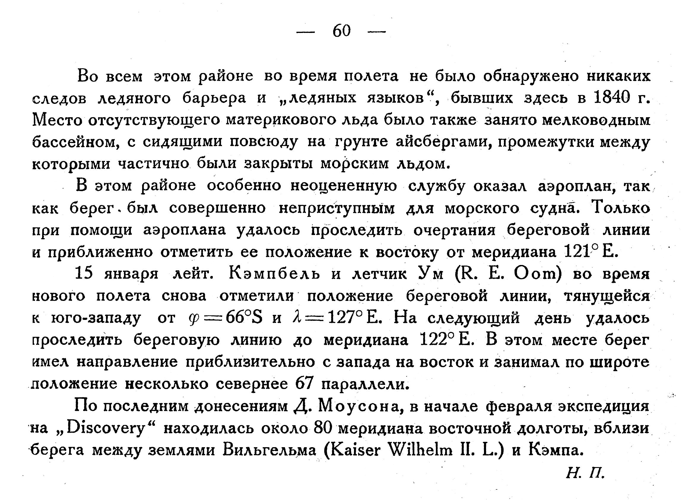 Во всем этом районе во время полета не было обнаружено никаких следов ледяного барьера и „ледяных языков“, бывших здесь в 1840 г. Место отсутствующего материкового льда было также занято мелководным бассейном, с сидящими повсюду на грунте айсбергами, промежутки между которыми частично были закрыты морским льдом.