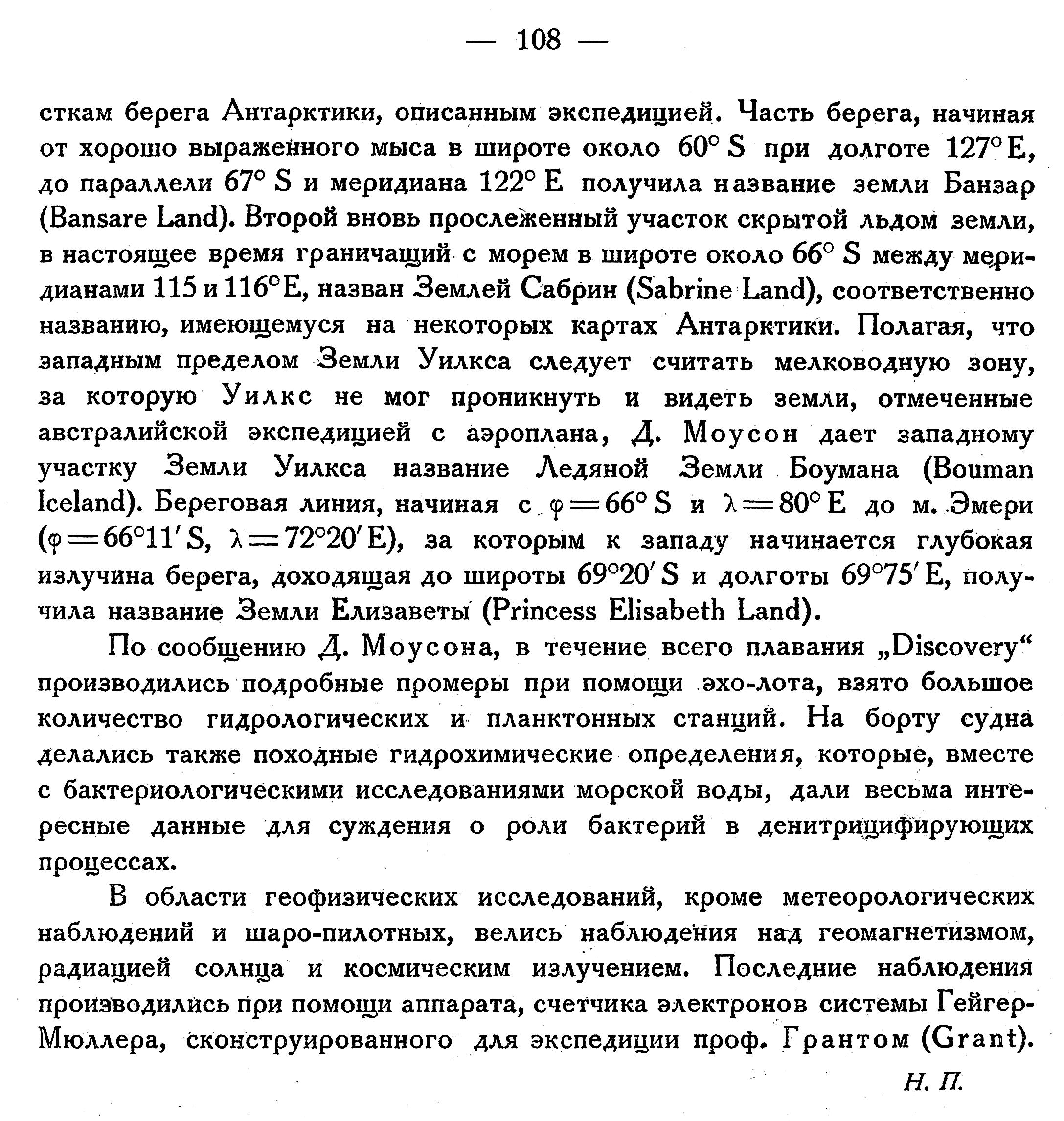 сткам берега Антарктики, описанным экспедицией. Часть берега, начиная от хорошо выраженного мыса в широте около 60° S при долготе 127° Е, до параллели 67° S и меридиана 122° Е получила название земли Банзар (Bansare Land). Второй вновь прослеженный участок скрытой льдом земли, в настоящее время граничащий с морем в широте около 66° S между меридианами 115 и116°Е, назван Землей Сабрин (Sabrine Land), соответственно названию, имеющемуся на некоторых картах Антарктики. Полагая, что западным пределом Земли Уилкса следует считать мелководную зону, за которую Уилкс не мог проникнуть и видеть земли, отмеченные австралийской экспедицией с аэроплана, Д. Моусон дает западному участку Земли Уилкса название Ледяной Земли Боумана (Bouman Iceland). Береговая линия, начиная с φ = 66°S и λ = 80°Е до м. Эмери (φ = 66°11'S, λ=72°20'Е), за которым к западу начинается глубокая излучина берега, доходящая до широты 69°20' S и долготы 69°75' Е, получила название Земли Елизаветы (Princess Elisabeth Land).