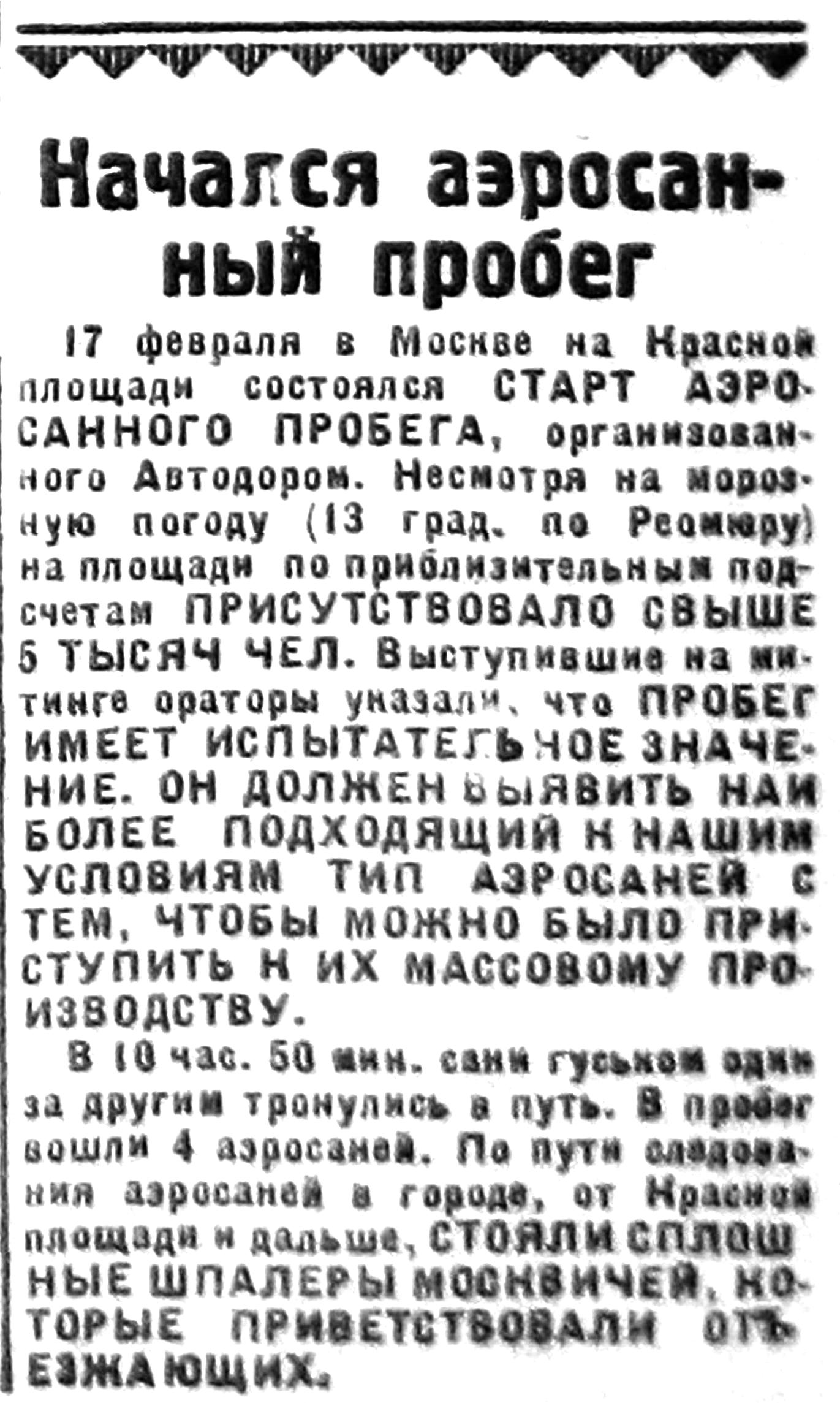 17 февраля в Москве на Красной площади состоялся СТАРТ АЭРОСАННОГО ПРОБЕГА, организованного Автодором. Несмотря на морозную погоду (13 град, по Реомюру) на площади по приблизительным подсчетам ПРИСУТСТВОВАЛО СВЫШЕ 5 ТЫСЯЧ ЧЕЛ. Выступившие на митинге ораторы указали, что ПРОБЕГ ИМЕЕТ ИСПЫТАТЕЛЬНОЕ ЗНАЧЕНИЕ. ОН ДОЛЖЕН ВЫЯВИТЬ НАИБОЛЕЕ ПОДХОДЯЩИЙ К НАШИМ УСЛОВИЯМ ТИП АЭРОСАНЕЙ С ТЕМ, ЧТОБЫ МОЖНО БЫЛО ПРИСТУПИТЬ К ИХ МАССОВОМУ ПРОИЗВОДСТВУ.