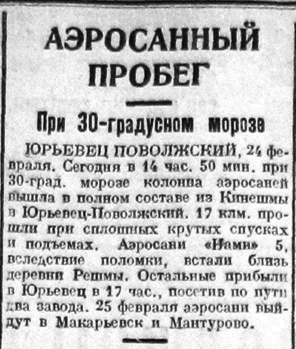 ЮРЬЕВЕЦ-ПОВОЛЖСКИЙ, 24 февраля. Сегодня и 14 час. 50 мин. при 30-град. морозе колонна аэросаней вышла в полном составе из Кинешмы в Юрьевец-Поволжский. 17 клм. прошли при сплошных крутых спусках и подъемах. Аэросани «Нами» 5, вследствие поломки, встали близь деревни Решмы. Остальные прибыли в Юрьевец в 17 час., посетив по пути два завода. 25 феврали аэросани выйдут в Макарьевск и Мантурово.