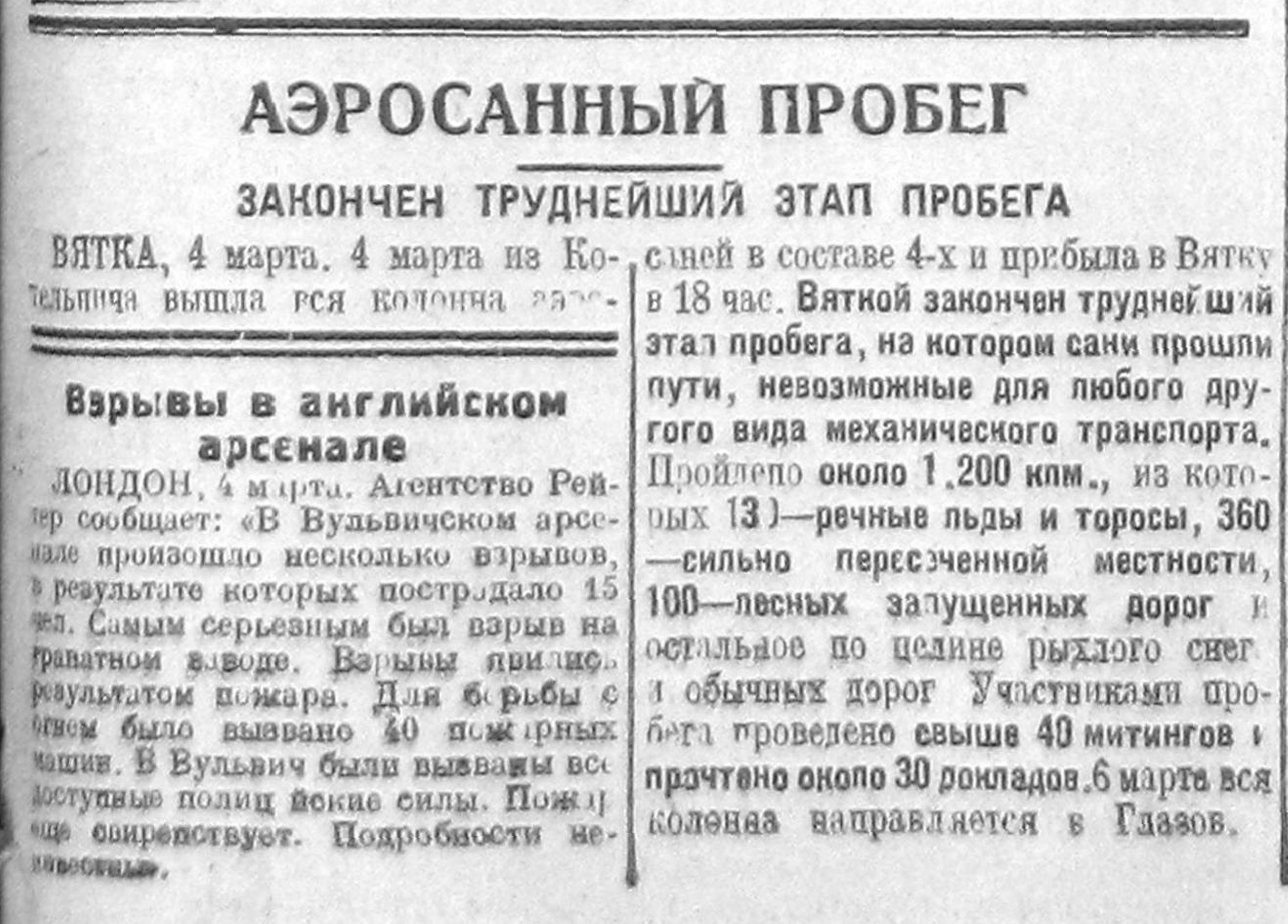 ВЯТКА, 4 марта. 4 марта из Котельнича вышла вся колонна аэросаней в составе 4-х и прибыла в Вятку в 18 час. Вяткой закончен труднейший этап пробега, на котором сани прошли пути, невозможные для любого другого вида механического транспорта. Пройдено около 1. 200 клм., из которых 130—речные льды и торосы, 360 —сильно пересечённой местности, 100—лесных запущенных дорог и остальное по целине рыхлого снега и обычных дорог. Участниками пробега проведено свыше 40 митингов и прочтено около 30 докладов. 6 марта вся колонна направляется в Глазов.