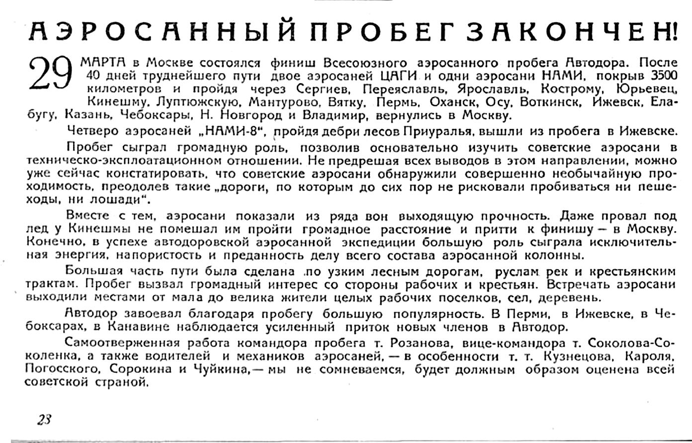 Вместе с тем, аэросани показали из ряда вон выходящую прочность. Даже провал под лед у Кинешмы не помешал им пройти громадное расстояние и притти к финишу — в Москву. Конечно, в успехе автодоровской аэросанной экспедиции большую роль сыграла исключительная энергия, напористость и преданность делу всего состава аэросанной колонны.