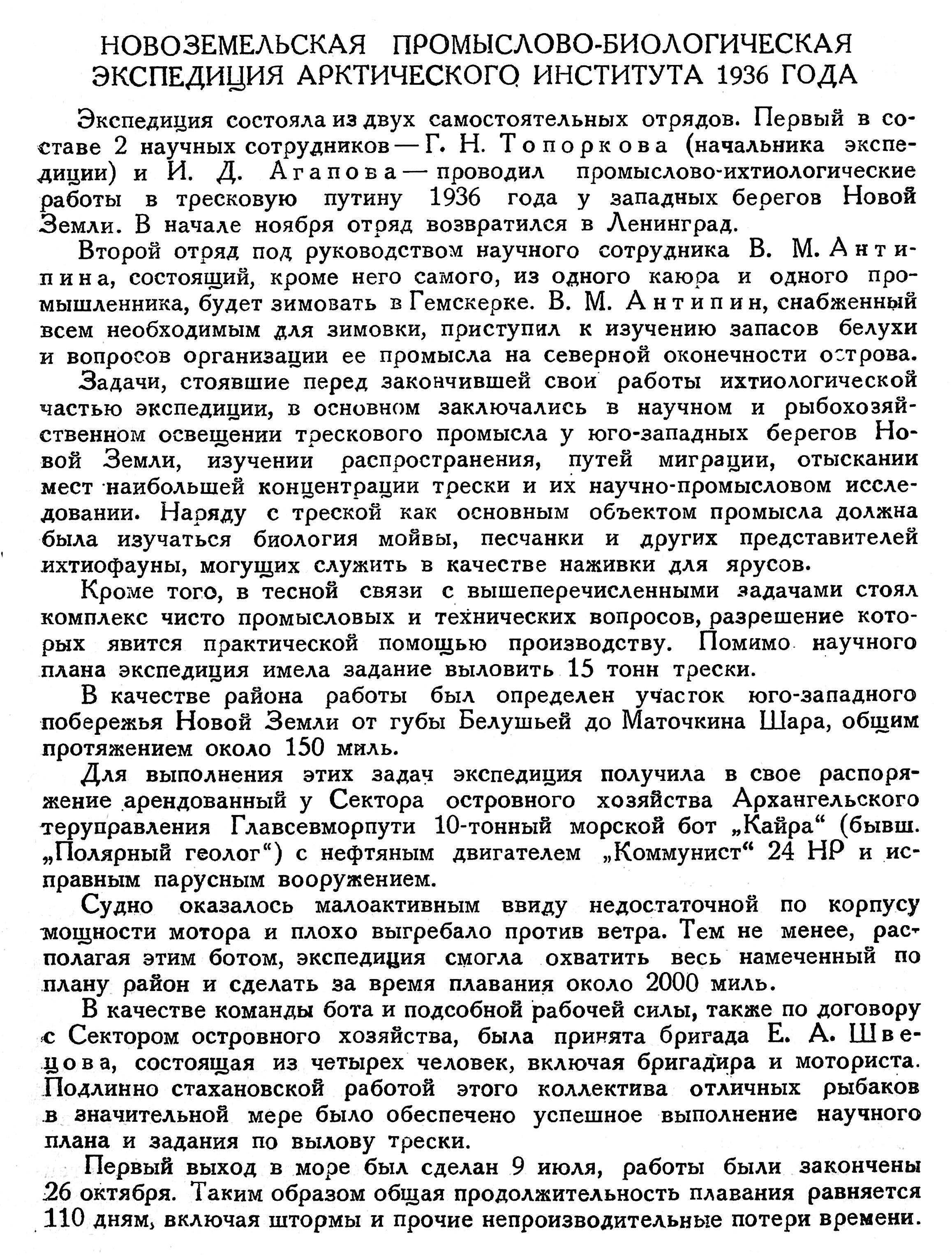 Экспедиция состояла из двух самостоятельных отрядов. Первый в составе 2 научных сотрудников — Г. Н. Топоркова (начальника экспедиции) и И. Д. Агапова — проводил промыслово-ихтиологические работы в тресковую путину 1936 года у западных берегов Новой Земли. В начале ноября отряд возвратился в Ленинград.