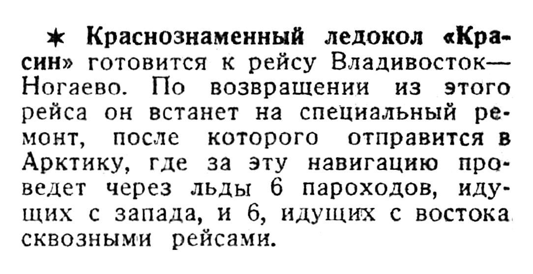 ♦ Краснознаменный ледокол «Кра­син» готовится к рейсу Владивосток — Ногаево. По возвращении из этого рейса он встанет на специальный ре­монт, после которого отправится в Арктику, где за эту навигацию про­ведет через льды 6 пароходов, иду­щих с запада, и 6, идущих с востока сквозными рейсами.