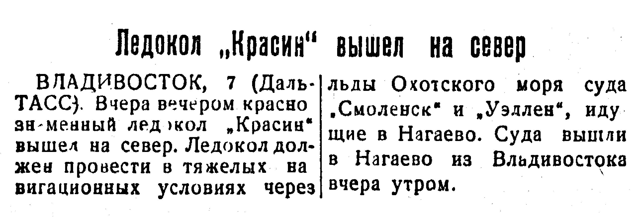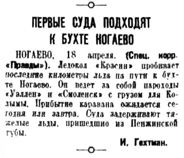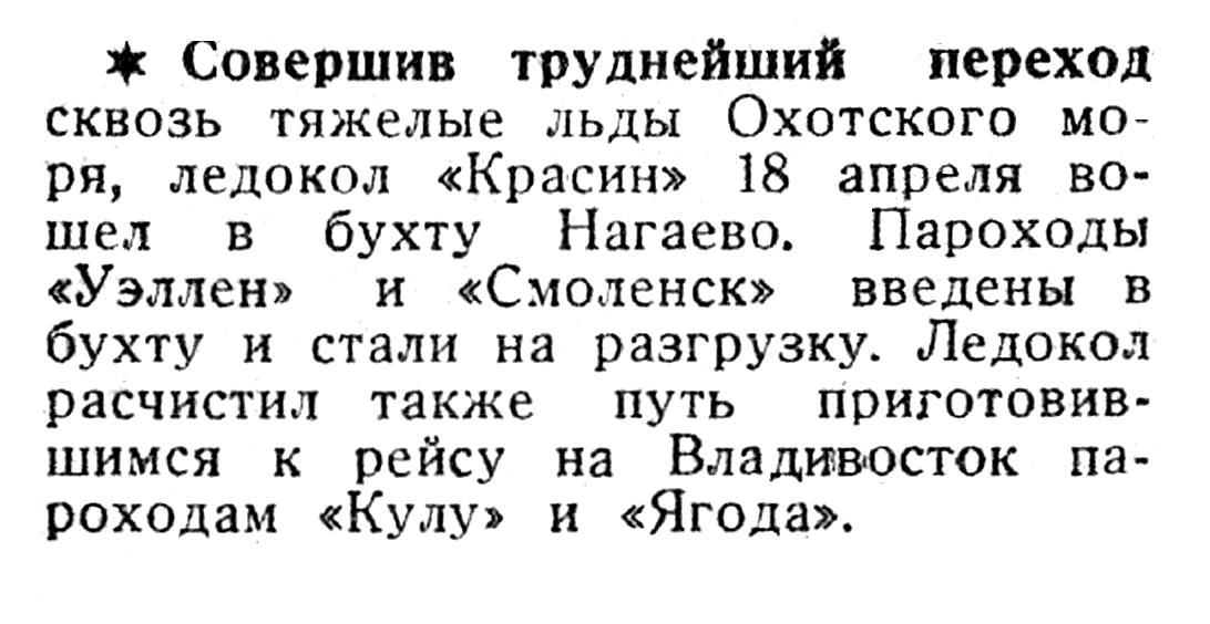 Совершив труднейший переход сквозь тяжелые льды Охотского мо­ря, ледокол «Красин» 18 апреля во­шел в бухту Нагаево. Пароходы «Уэллен» и «Смоленск» введены в бухту и стали на разгрузку. Ледокол расчистил также путь приготовив­шимся к рейсу на Владивосток па­роходам «Кулу» и «Ягода».
