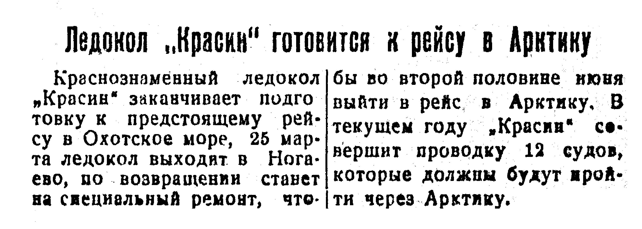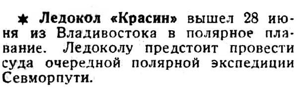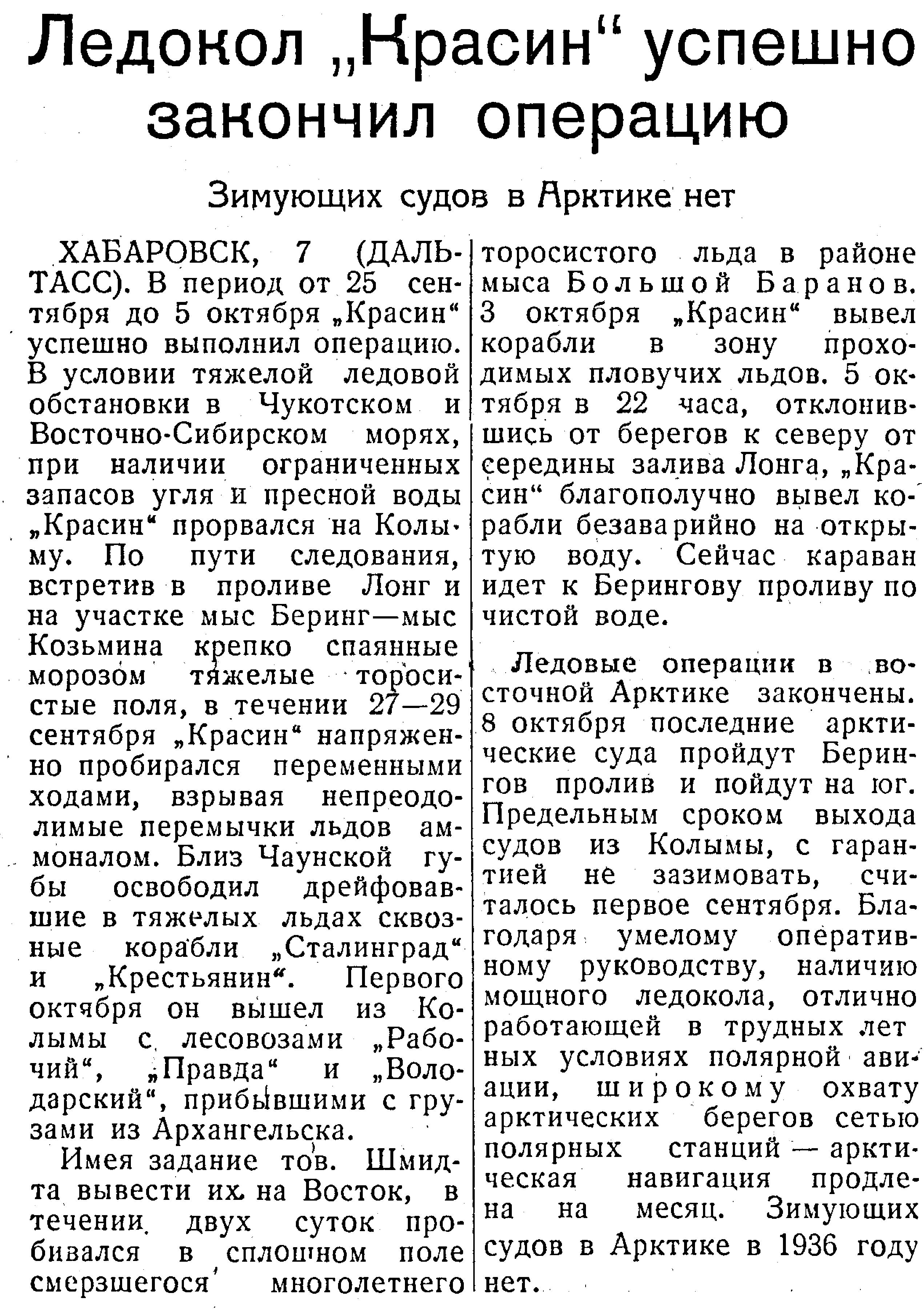 ХАБАРОВСК, 7 (ДАЛЬТАСС). В период от 25 сентября до 5 октября "Красин" успешно выполнил операцию. В условии тяжелой ледовой обстановки в Чукотском и Восточно-Сибирском морях, при наличии ограниченных запасов угля и пресной воды "Красин" прорвался на Колыму. По пути следования, встретив в проливе Лонг и на участке мыс Беринг — мыс Козьмина крепко спаянные морозом тяжелые торосистые поля, в течении 27—29 сентября "Красин" напряженно пробирался переменными ходами, взрывая непреодолимые перемычки льдов аммоналом. Близ Чаунской губы освободил дрейфовавшие в тяжелых льдах сквозные корабли "Сталинград" и "Крестьянин". Первого октября он вышел из Колымы с лесовозами "Рабочий", "Правда" и "Володарский", прибившими с грузами из Архангельска.