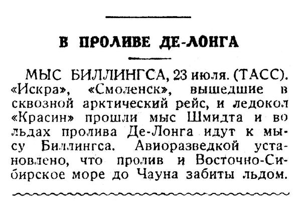 МЫС БИЛЛИНГСА, 23 июля. (ТАСС). «Искра», «Смоленск», вышедшие в сквозной арктический рейс, и ледокол «Красин» прошли мыс Шмидта и во льдах пролива Де-Лонга идут к мысу Биллингса. Авиоразведкой установлено, что пролив и Восточно-Сибирское море до Чауна забиты льдом.