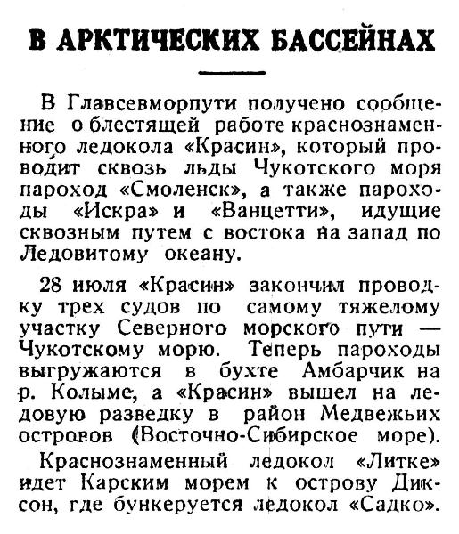 В Главсевморпути получено сообще­ние о блестящей работе краснознамен­ного ледокола «Красин», который про­водит сквозь льды Чукотского моря пароход «Смоленск», а также парохо­ды «Искра» и «Ванцетти», идущие сквозным путем с востока на запад по Ледовитому океану.