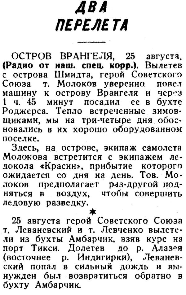 ОСТРОВ ВРАНГЕЛЯ, 25 августа. (Радио от наш. спец. корр.). Вылетев с острова Шмидта, герой Советского Союза т. Молоков уверенно повел машину к острову Врангеля и через 1 ч. 45 минут посадил ее в бухте Роджерса. Тепло встреченные зимов­щиками, мы на три-четыре дня обос­новались в их хорошо оборудованном поселке.