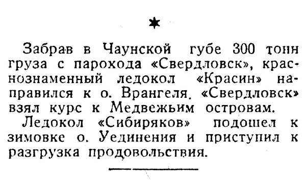 Забрав в Чаунской губе 300 тонн груза с парохода «Свердловск», крас­нознаменный ледокол «Красин» на­правился к о. Врангеля. «Свердловск» взял курс к Медвежьим островам.